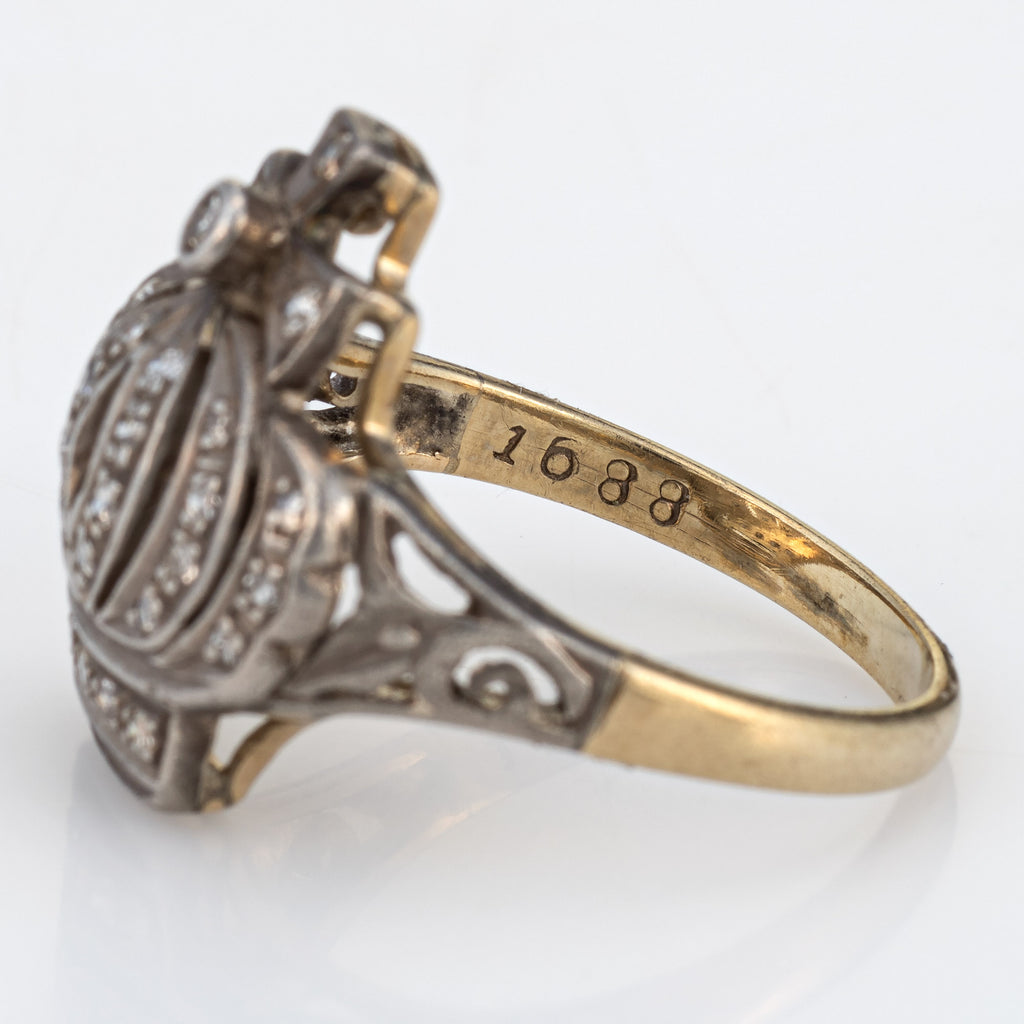 Metal & Hallmark: 9 karat yellow & white gold. The ring is not hallmarked though it has tested positive for 9k gold.