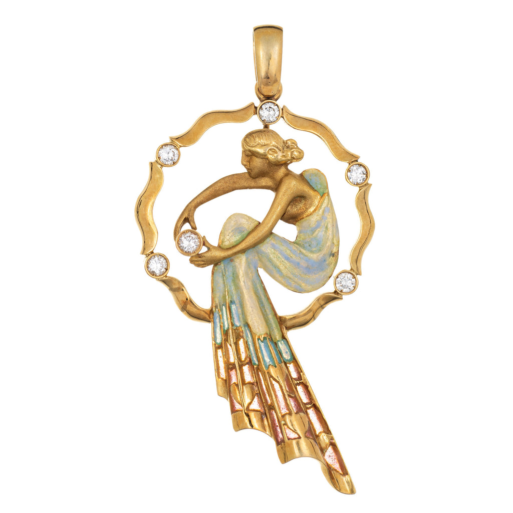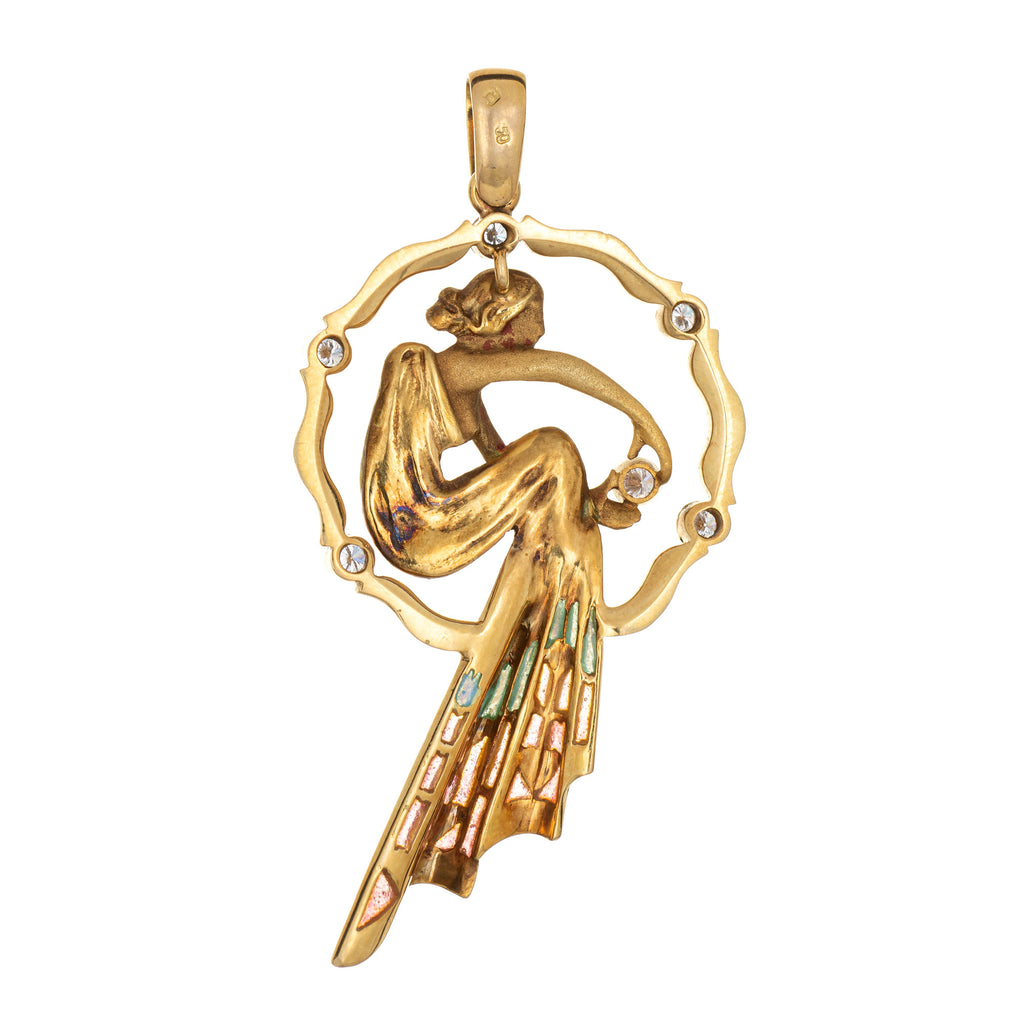 6 round brilliant cut diamonds total an estimated 0.60 carats (estimated at H-I color and VS2-SI1 clarity). The beautifully detailed pendant highlights a woman sitting within an undulating round frame and holding a diamond. Art Nouveau in style, her long and flowing dress features luminous enameling in shades of light blue and pink. The piece is great worn alone as a statement piece or layered with your fine jewelry from any era.