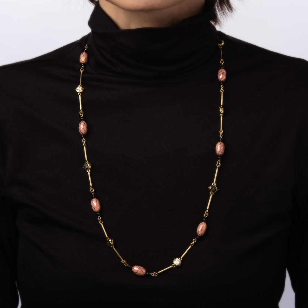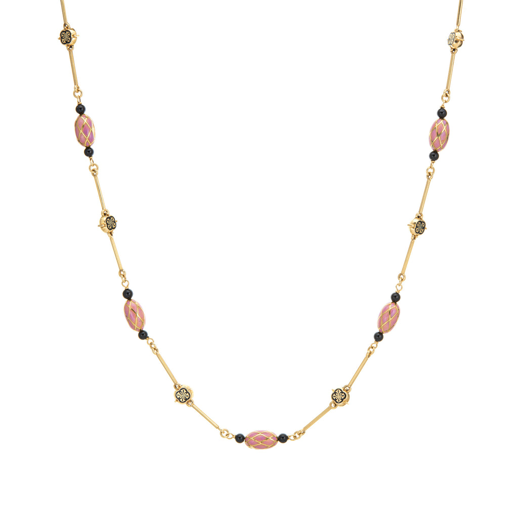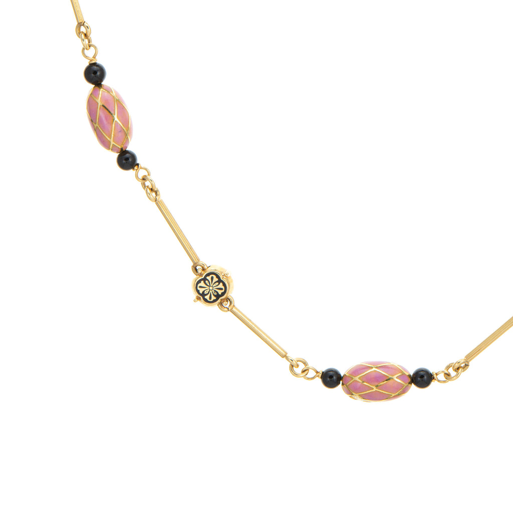The beautifully crafted necklace features pink enameled orbs framed with black onyx beads to both ends, with an alternating pattern of smaller black enameled floral panels. The necklace is long at 27 inches with a hefty feel of 44.4 grams, a great piece to wear alone or layered with your fine jewelry from any era.