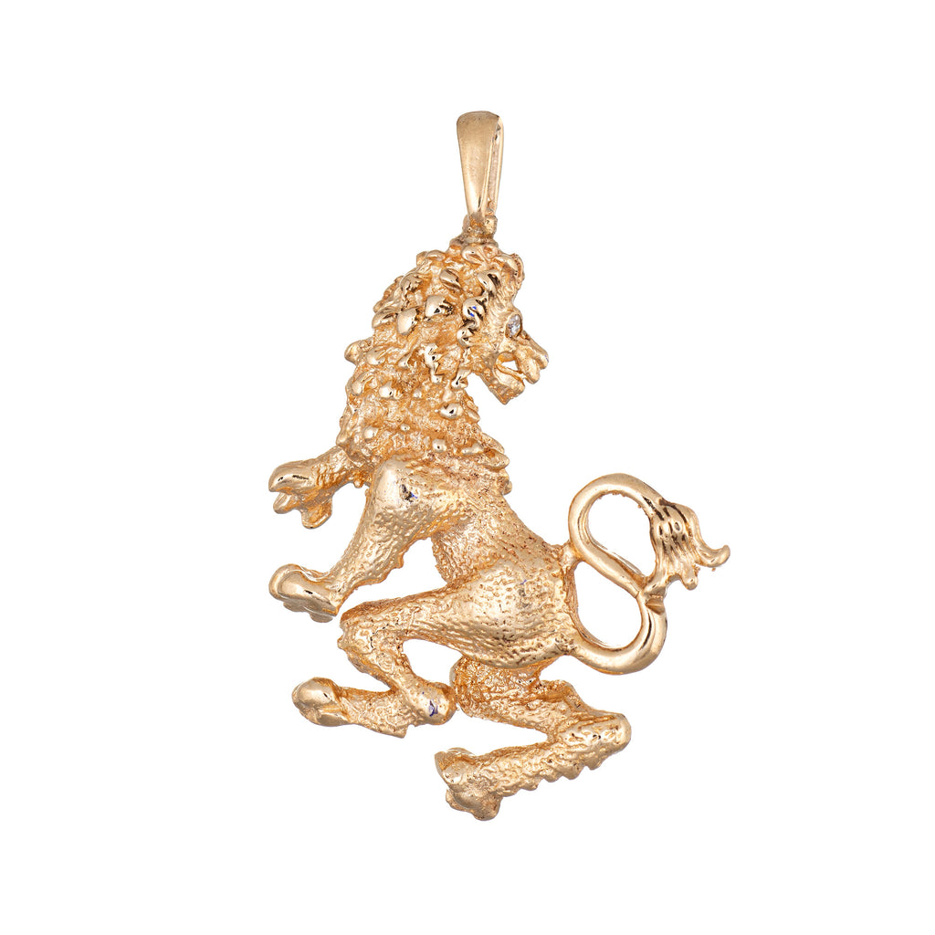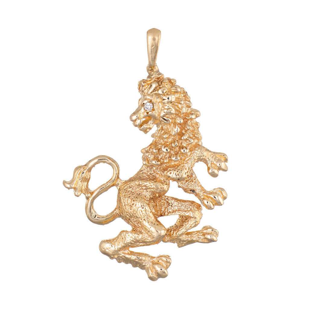 Vintage Lion Pendant 14k Yellow Gold Diamond Eye Standing Turning Head Jewelry