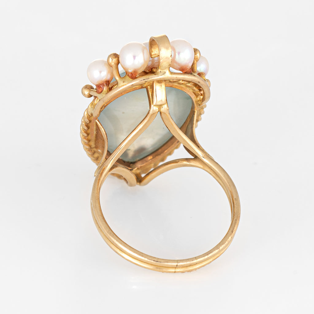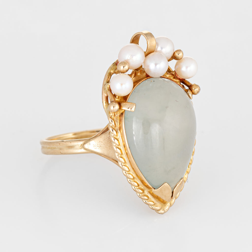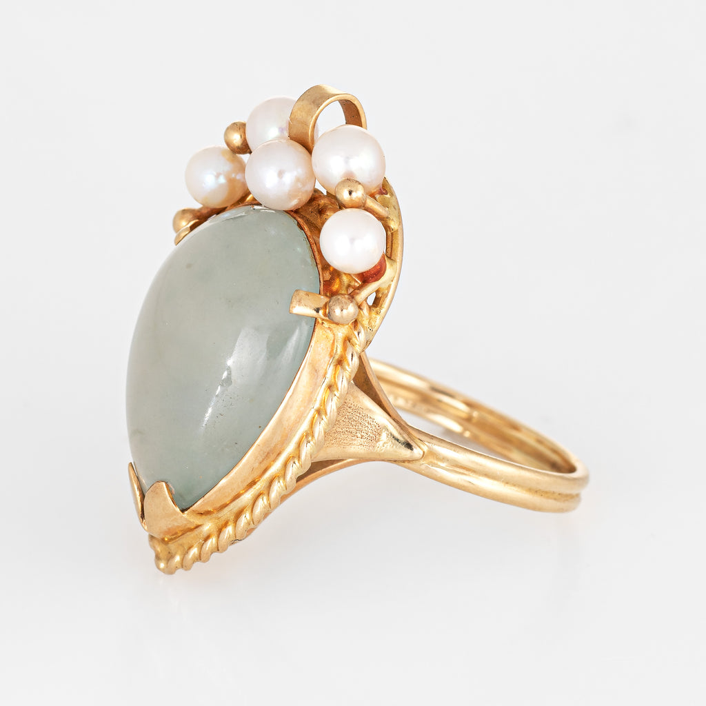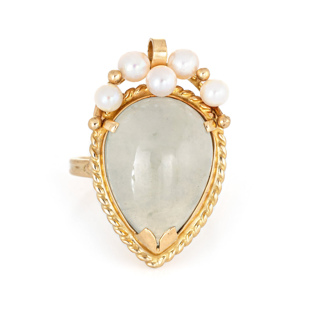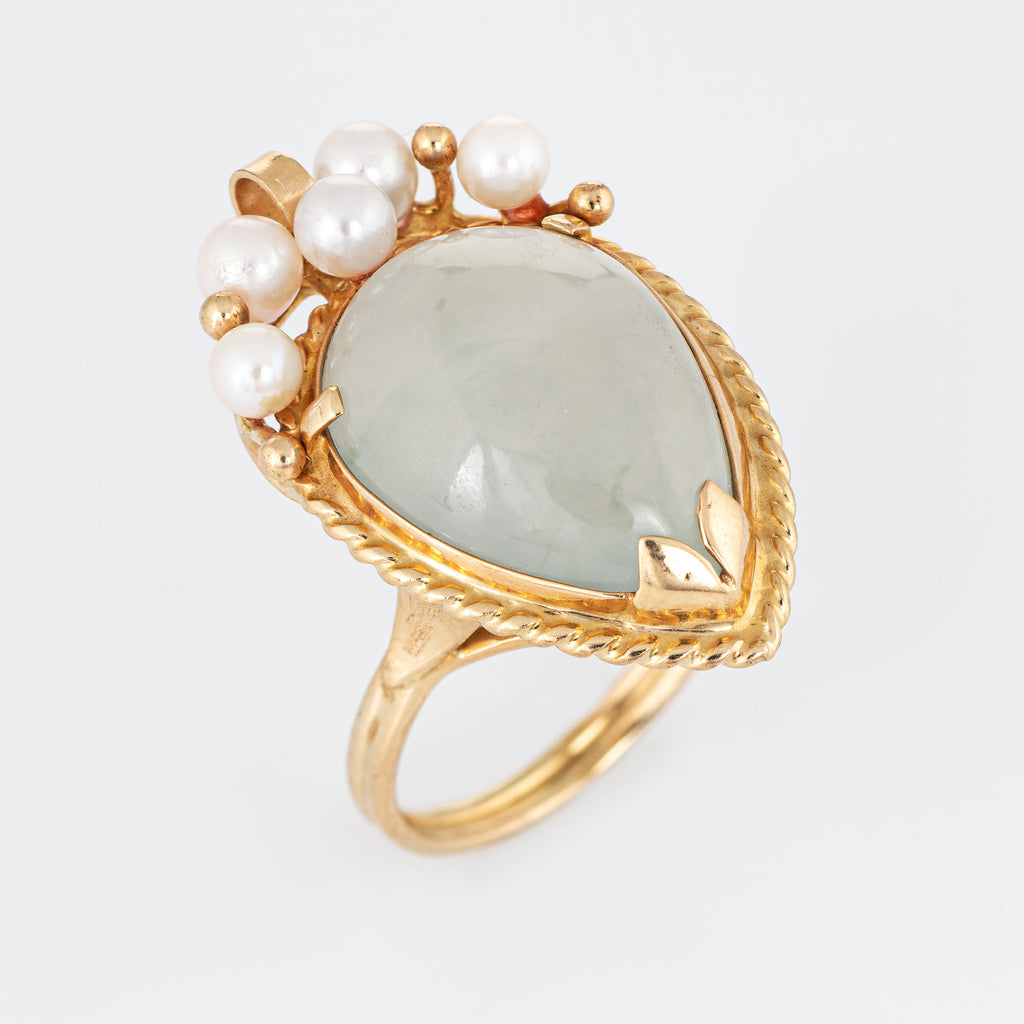 Stylish vintage Ming's jade & cultured pearl cocktail ring crafted in 14 karat yellow gold.