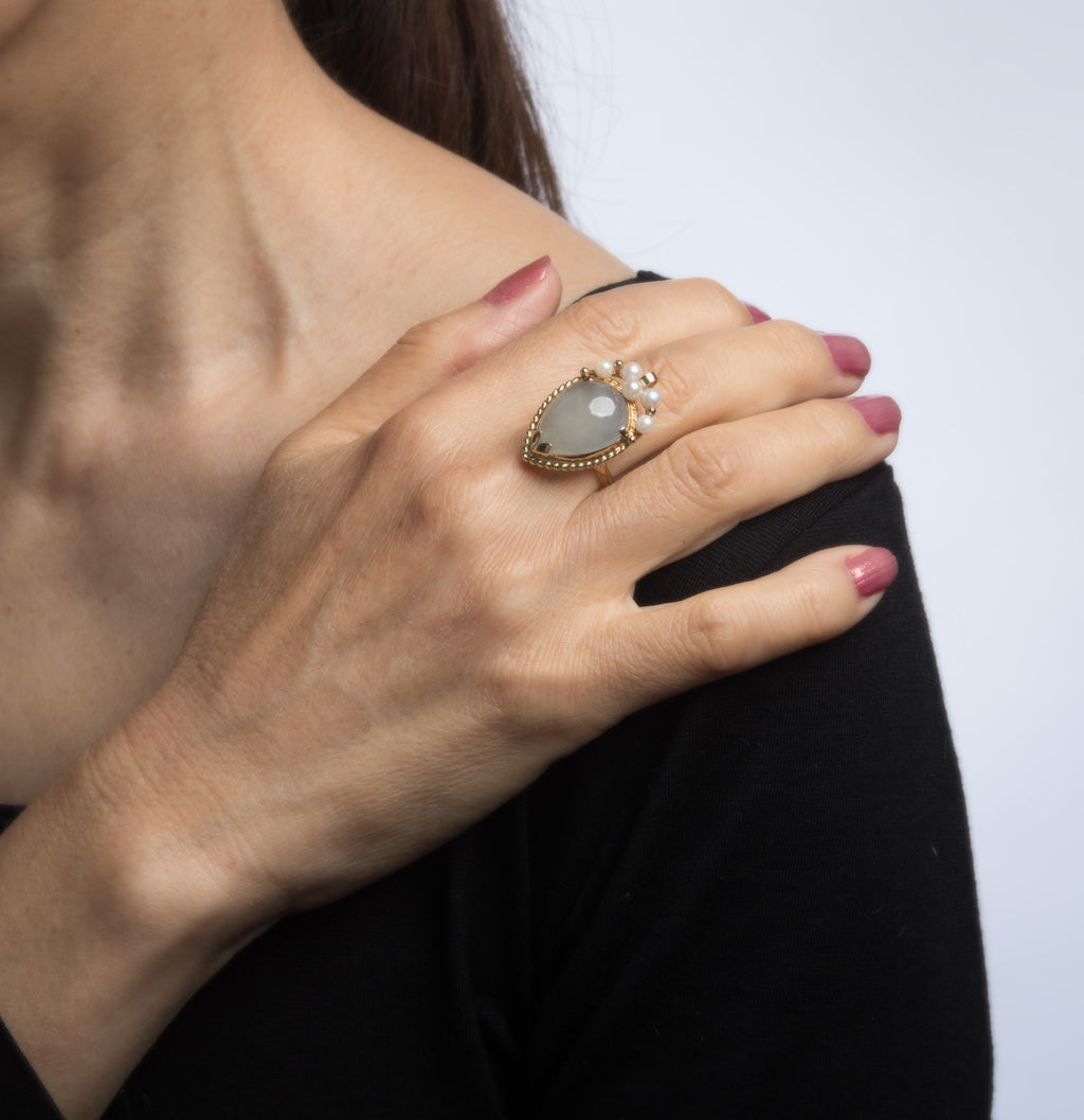 The light green jade is securely set in a pear shaped mount with rope detailing and pearls to the top of the ring. Ming's of Hawaii is known for high quality jewelry. They ceased production in 1999 with their jewelry now desired collector pieces. The medium rise ring (10mm - 0.39 inches) sits comfortably on the finger. The colorful ring is impactful in design and ideal worn day or night.