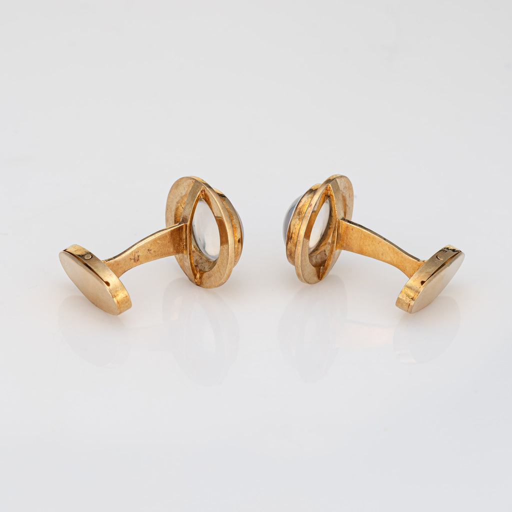 Stones: Cabochon cut moonstones each measure 11mm x 9mm. The cufflinks are in very good condition and free of cracks or chips.