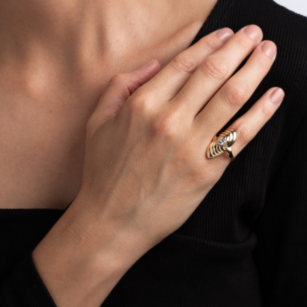 Crafted in two-tone yellow & rose gold the ring is crafted in an elongated navette style. A striking and unique design that makes a nice statement on the hand. The low rise ring (6mm - 0.23 inches) sits comfortably on the finger.