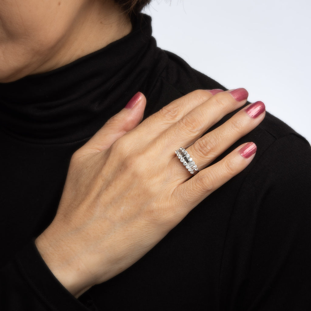 The simple and elegant band is set with straight baguette cut diamonds to the center, bordered with round brilliant cut diamonds on both sides. The ring is great worn alone or stacked with your fine jewelry from any era. The low rise band (4mm - 0.15 inches) sits comfortably on the finger.