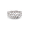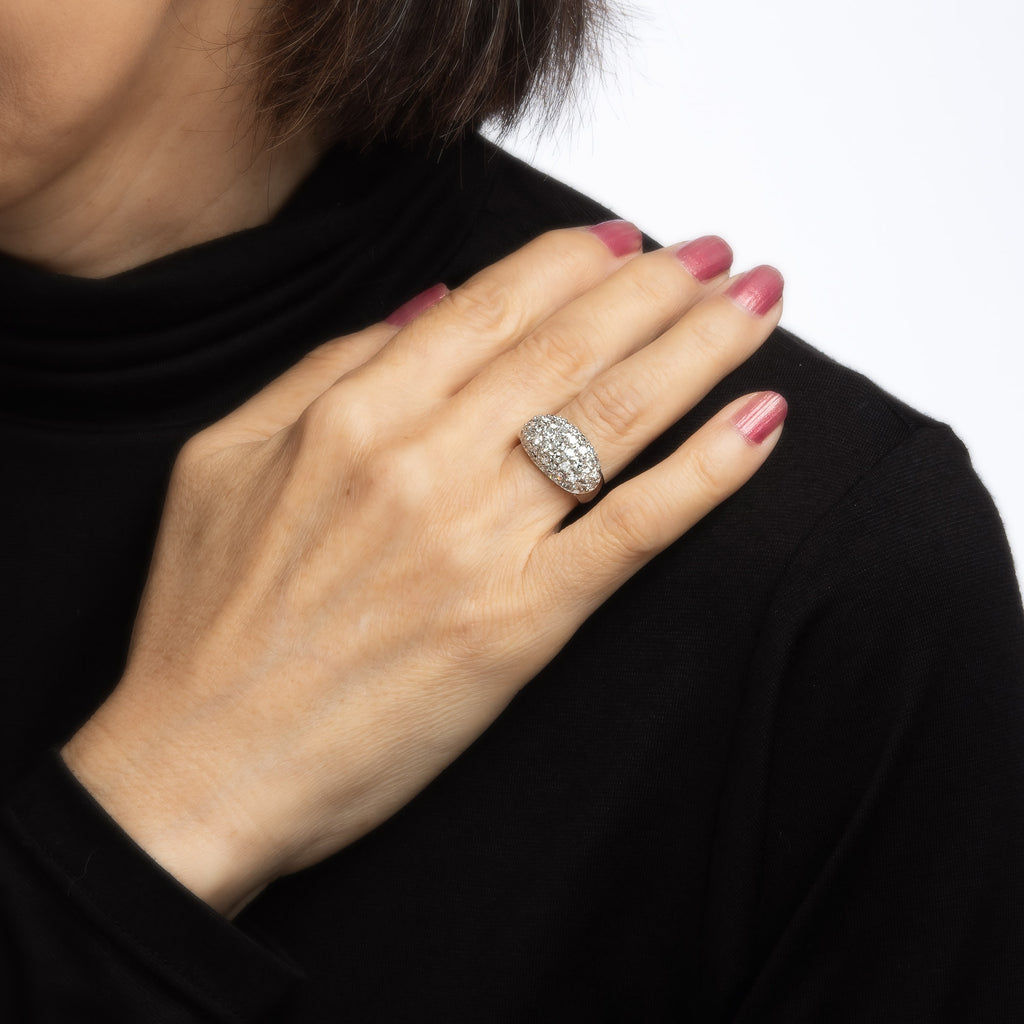 The domed ring features 7 rows of diamonds, pave set to allow for maximum sparkle and fire. The medium rise ring (6mm - 0.23 inches) sits comfortably on the finger.