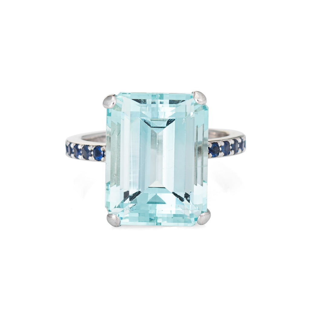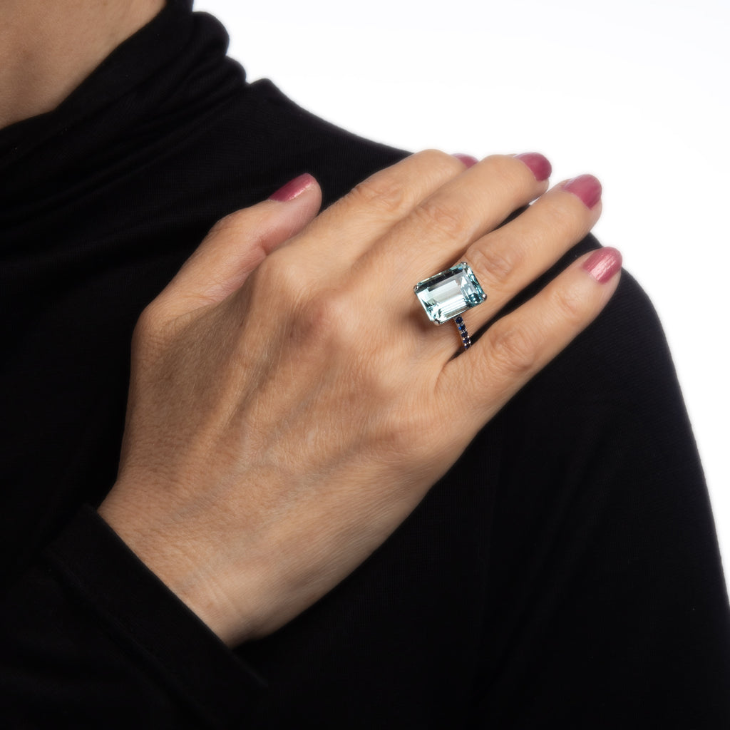 The clear as sky blue aquamarine is accented with blue sapphires, adding color and contrast. Ideal worn as a gemstone engagement ring or right hand ring for everyday wear. The ring makes a great statement on the hand with a medium rise (9mm - 0.35 inches) and sits comfortably on the finger.