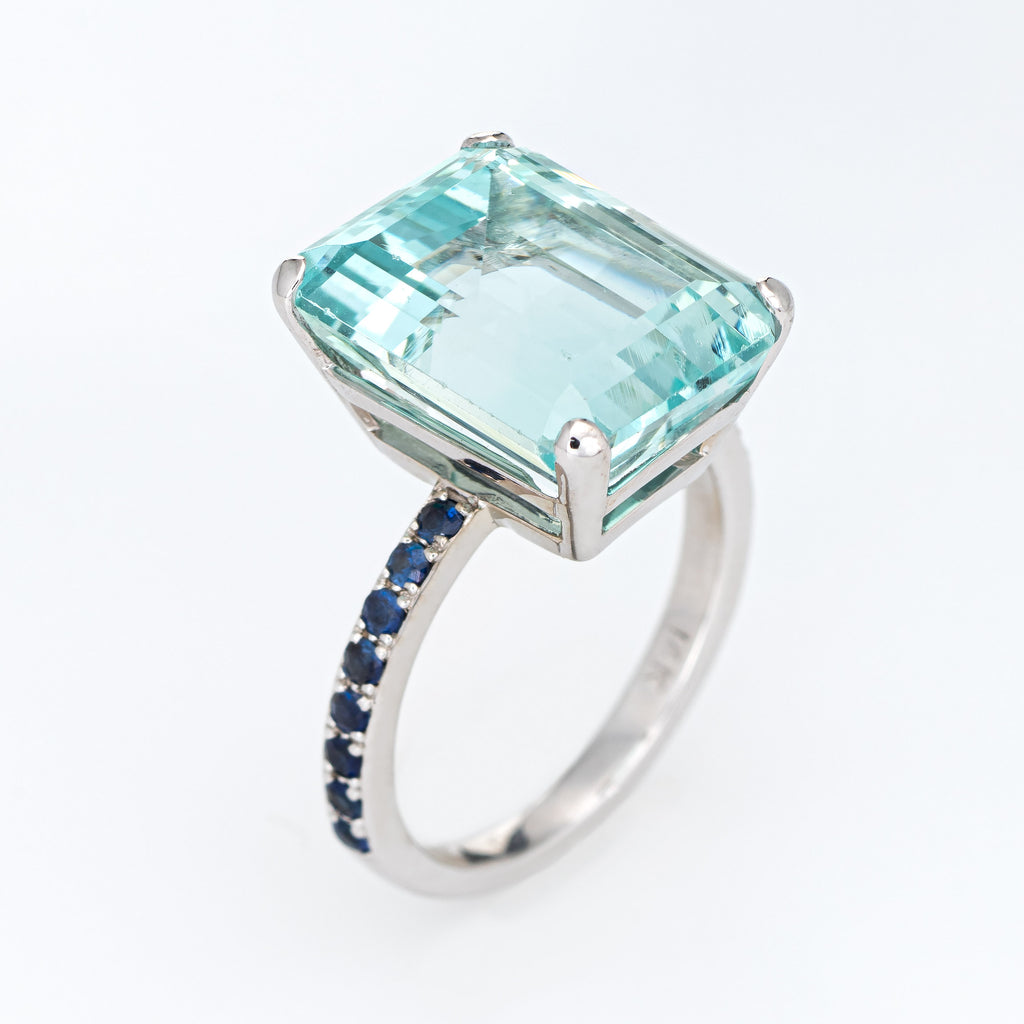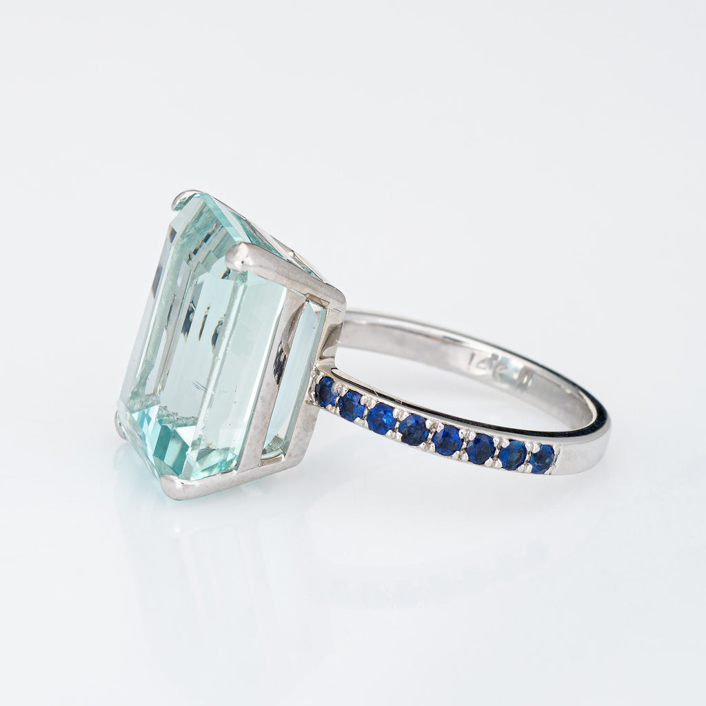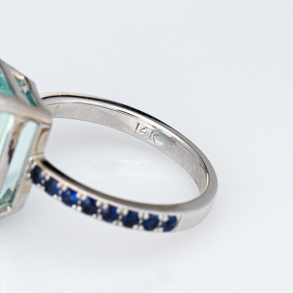 Stylish emerald cut aquamarine & sapphire ring (circa 1980s to 1990s) crafted in 14k white gold.