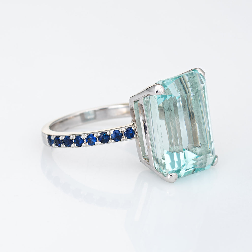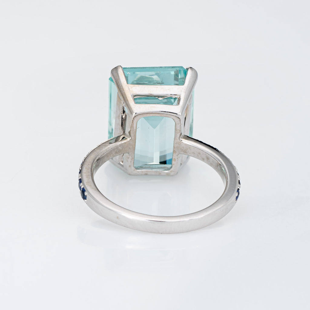 Stones: Emerald cut aquamarine measures 15mm x 11.5mm (estimated at 10 carats). 16 estimated 0.02 carat blue sapphires total an estimated 0.32 carats. The aquamarine is in excellent condition and free of cracks or chips.