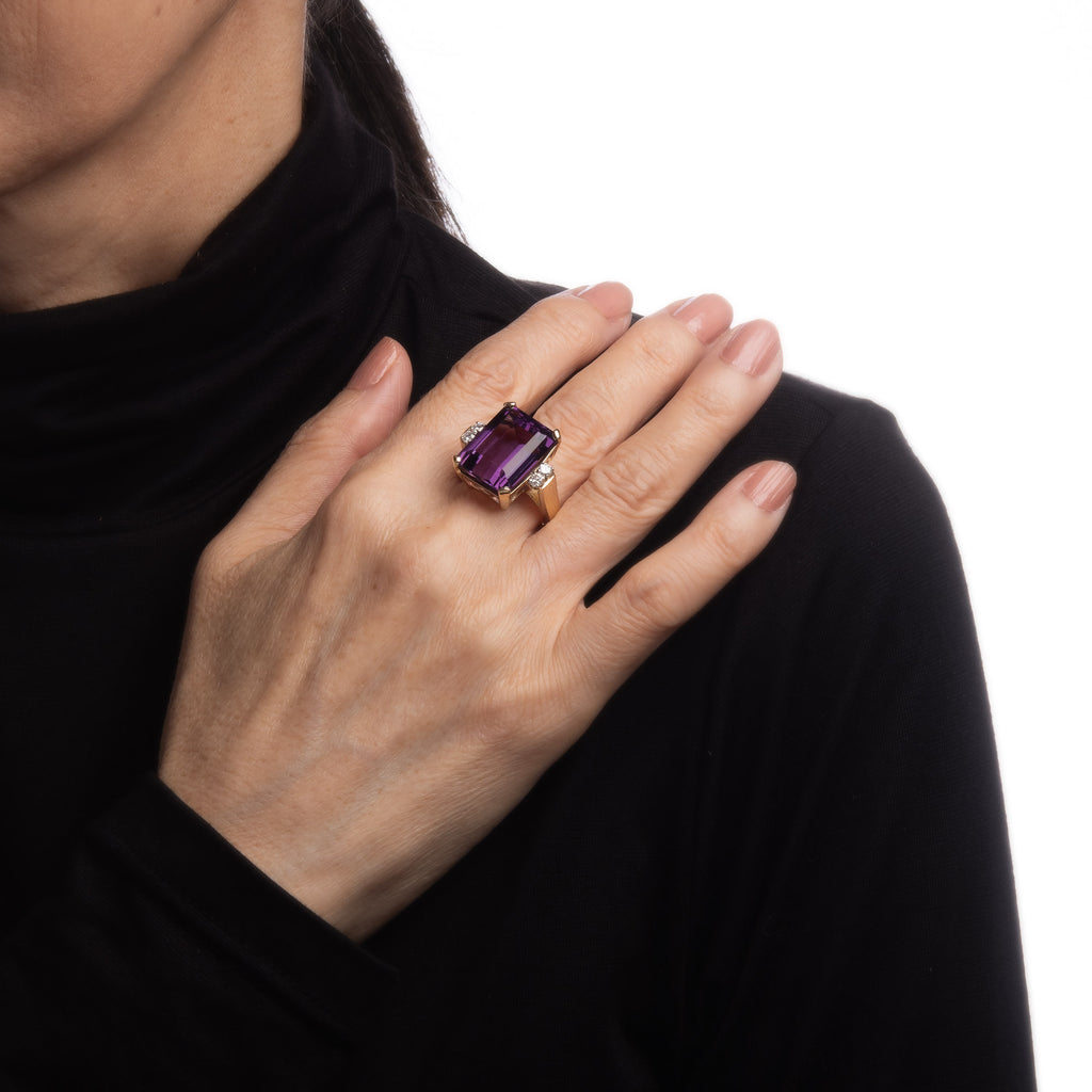 Stones: Emerald cut amethyst measures 17mm x 13mm (estimated at 14.50 carats). The amethyst is in very good condition and free of cracks or chips. Four diamonds total an estimated 0.20 carats (estimated at H-I color and VS2-SI1 clarity).