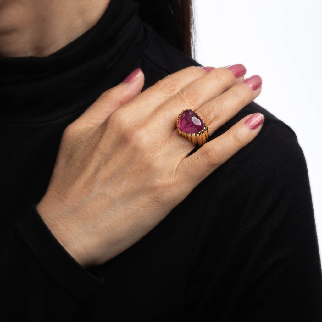 The candy pink heart tourmaline is cabochon cut and securely set into the multi pronged mount. The cocktail ring makes a nice statement on the hand. The medium rise ring (9.5mm - 0.37 inches) sits comfortably on the finger.