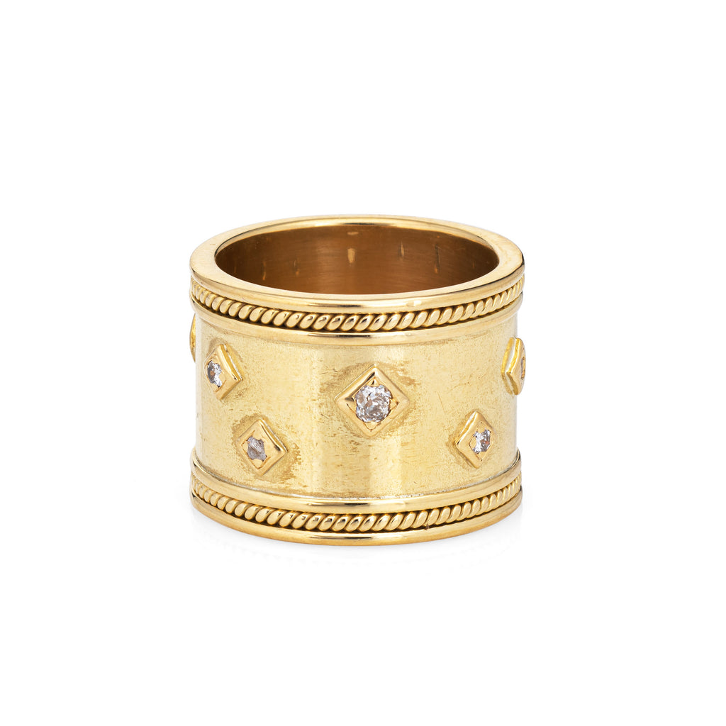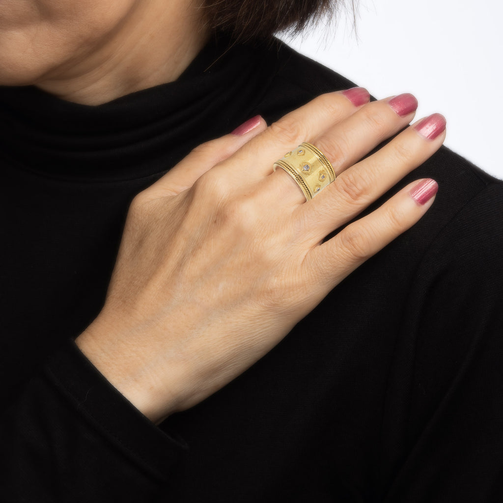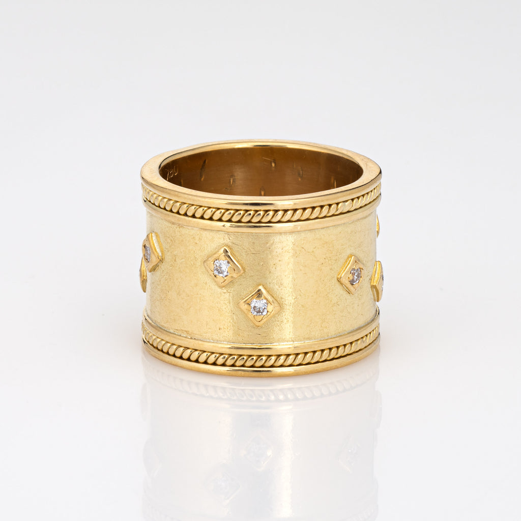 The wide band ring (16mm - 0.62 inches) makes a great statement on the hand. The ring is Etruscan in style, with rope style edging and diamonds set in random form around the band. Great worn alone or stacked with your fine jewelry from any era. The low rise ring (2mm - 0.07 inches) sits flat and comfortably on the finger.