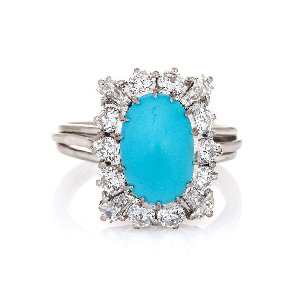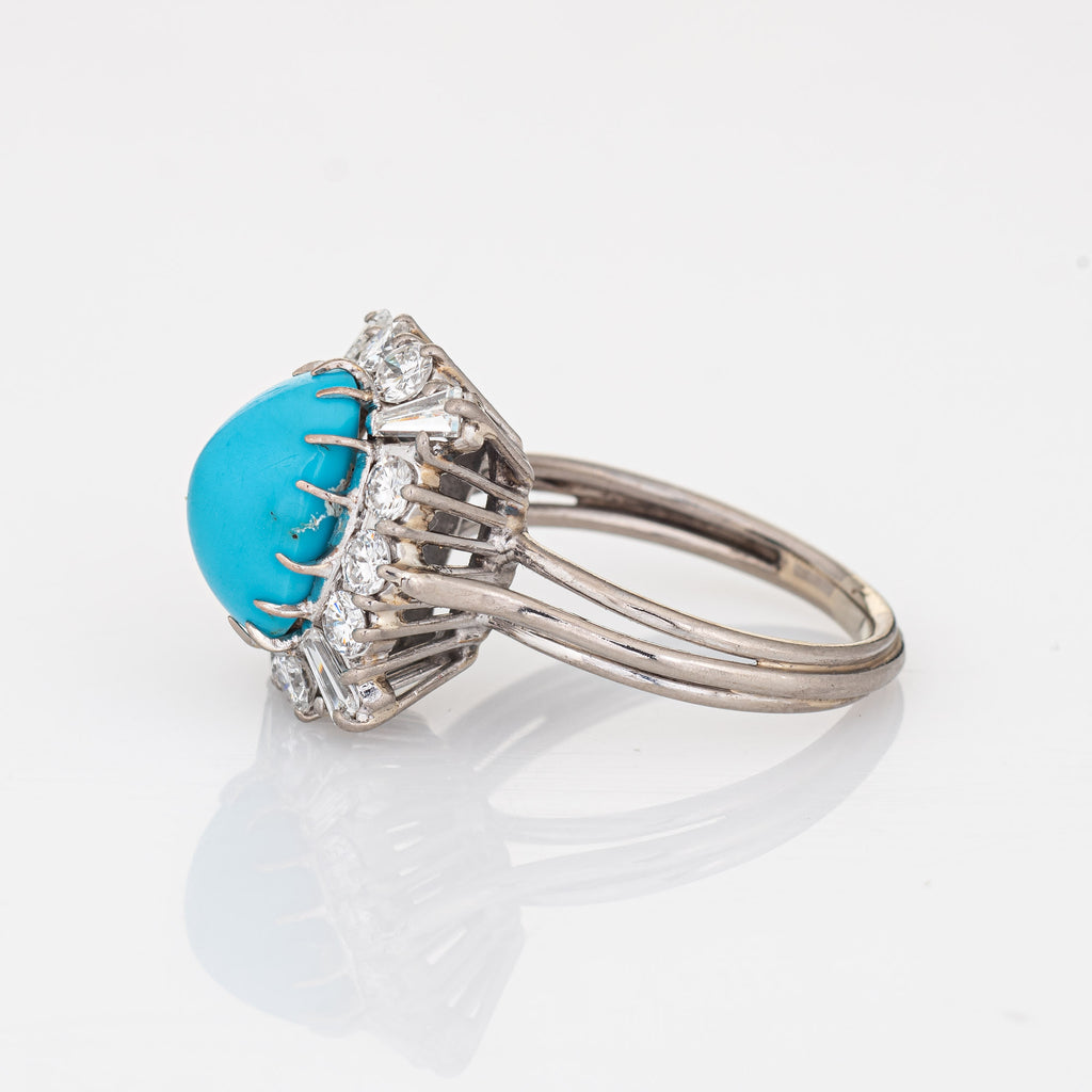 Cabochon turquoise measures 11mm x 8mm (estimated at 5 carats), accented with an estimated 1 carat of mixed cut diamonds (round brilliant and baguette cut). The diamonds are estimated at H-I color and VS2-SI2 clarity). The turquoise is in very good condition and free of cracks or chips.