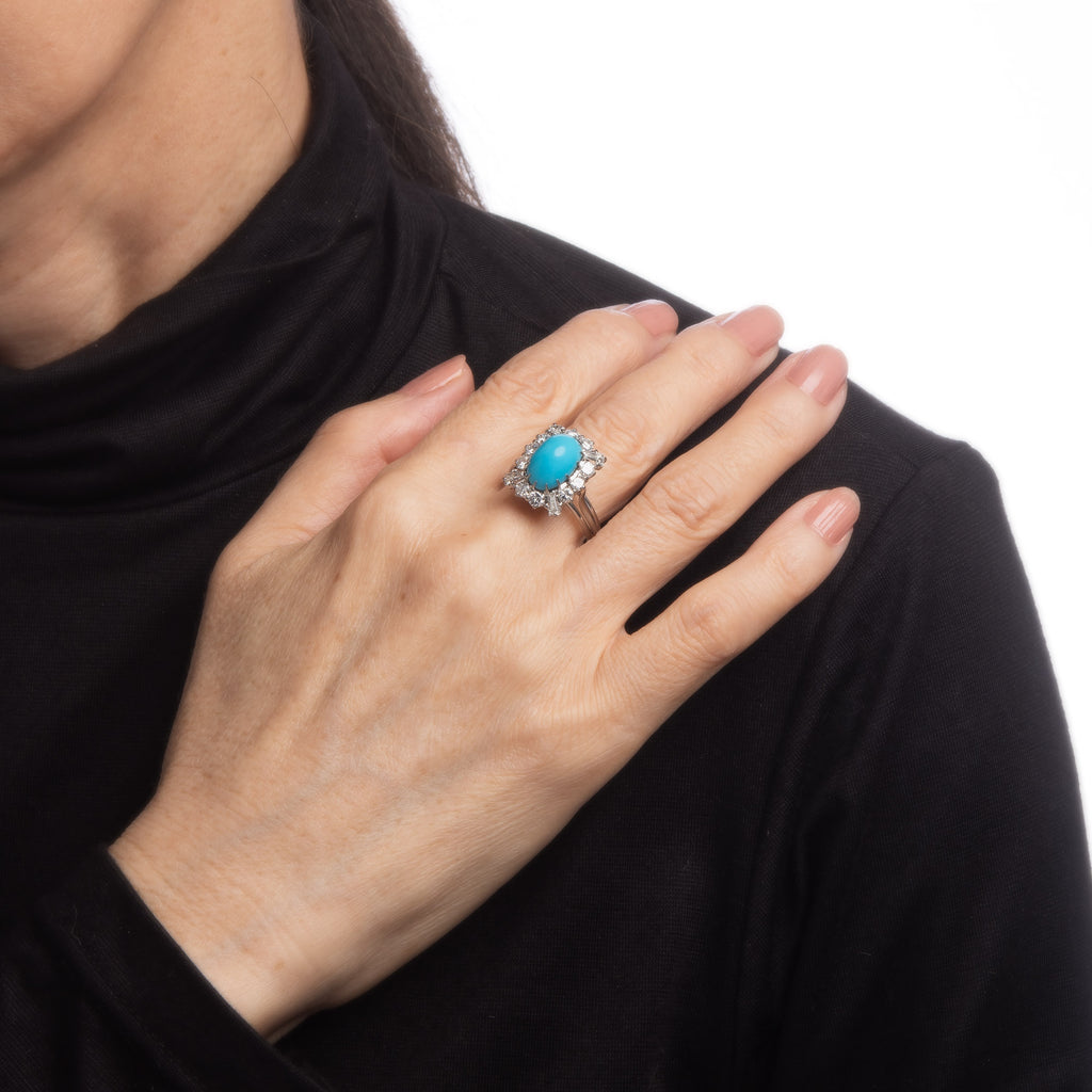 Stylish vintage turquoise & diamond cocktail ring (circa 1950s to 1960s) crafted in 18 karat white gold.