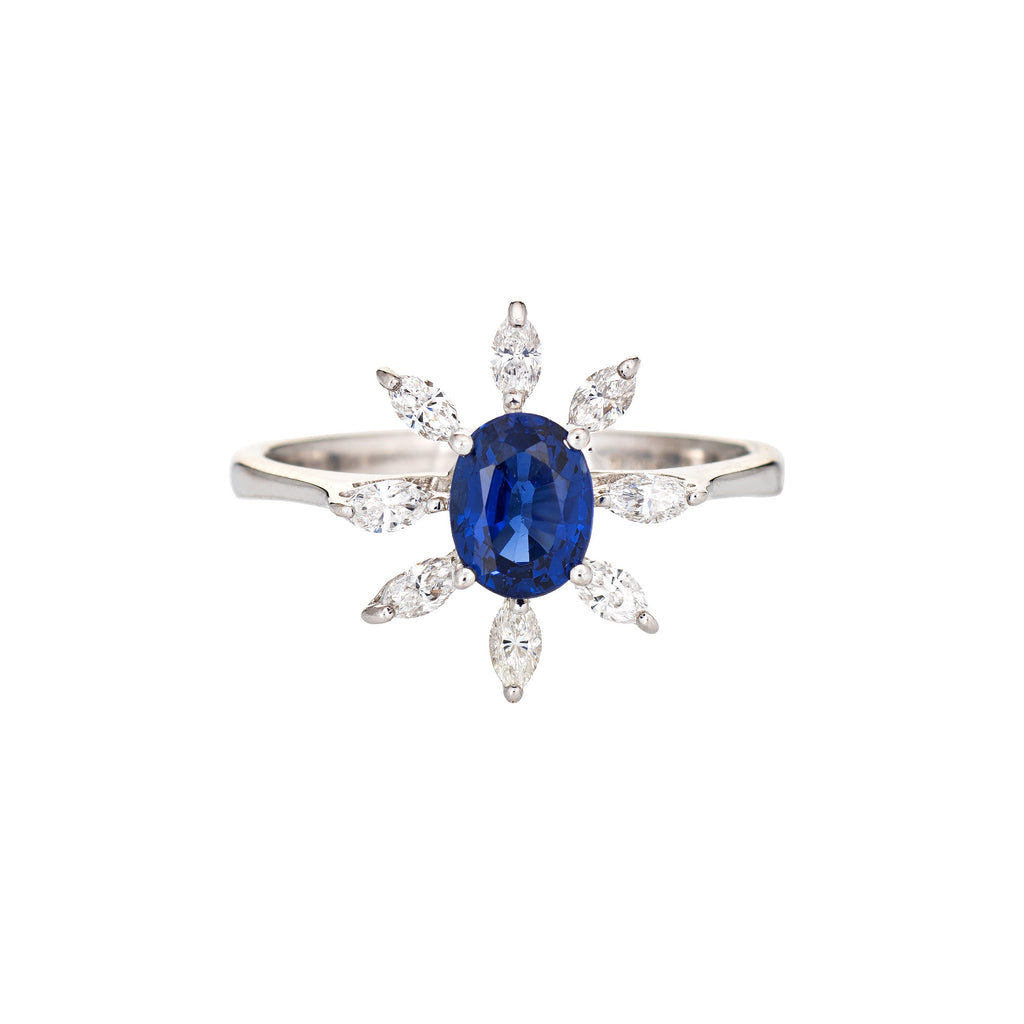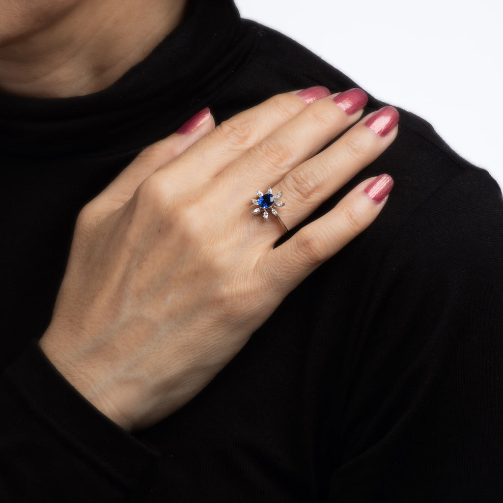 The sapphire is a beautiful royal blue color, accented with shimmering marquise cut diamonds in a daisy flower style mount. A charming ring great for everyday wear, or perhaps to consider as an alternative gemstone engagement ring. The diamonds and sapphire are securely set into pronged mounts. The low rise ring (6.6mm - 0.25 inches) sits comfortably on the finger.