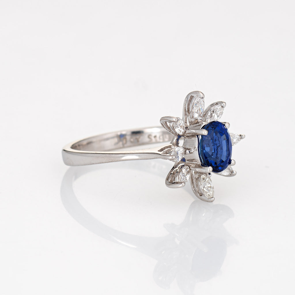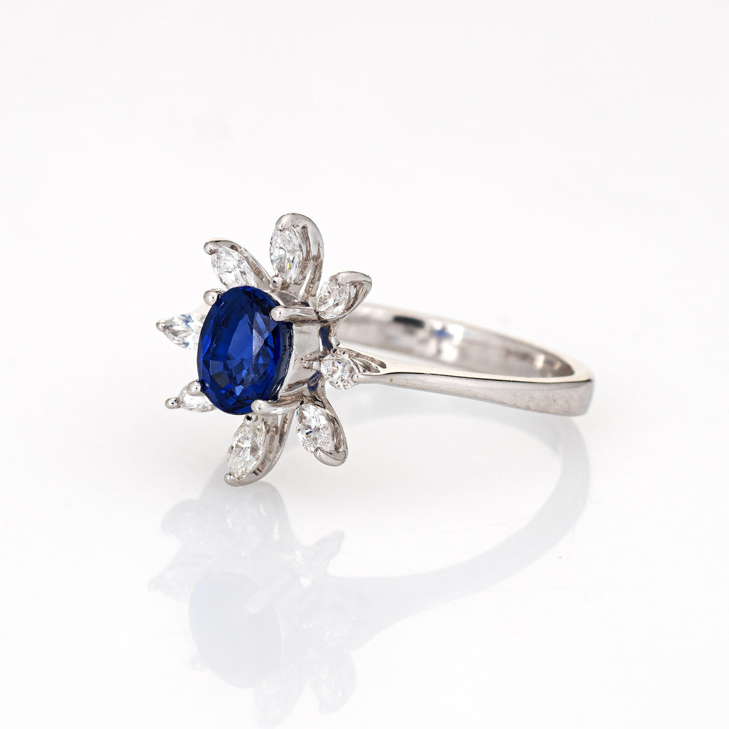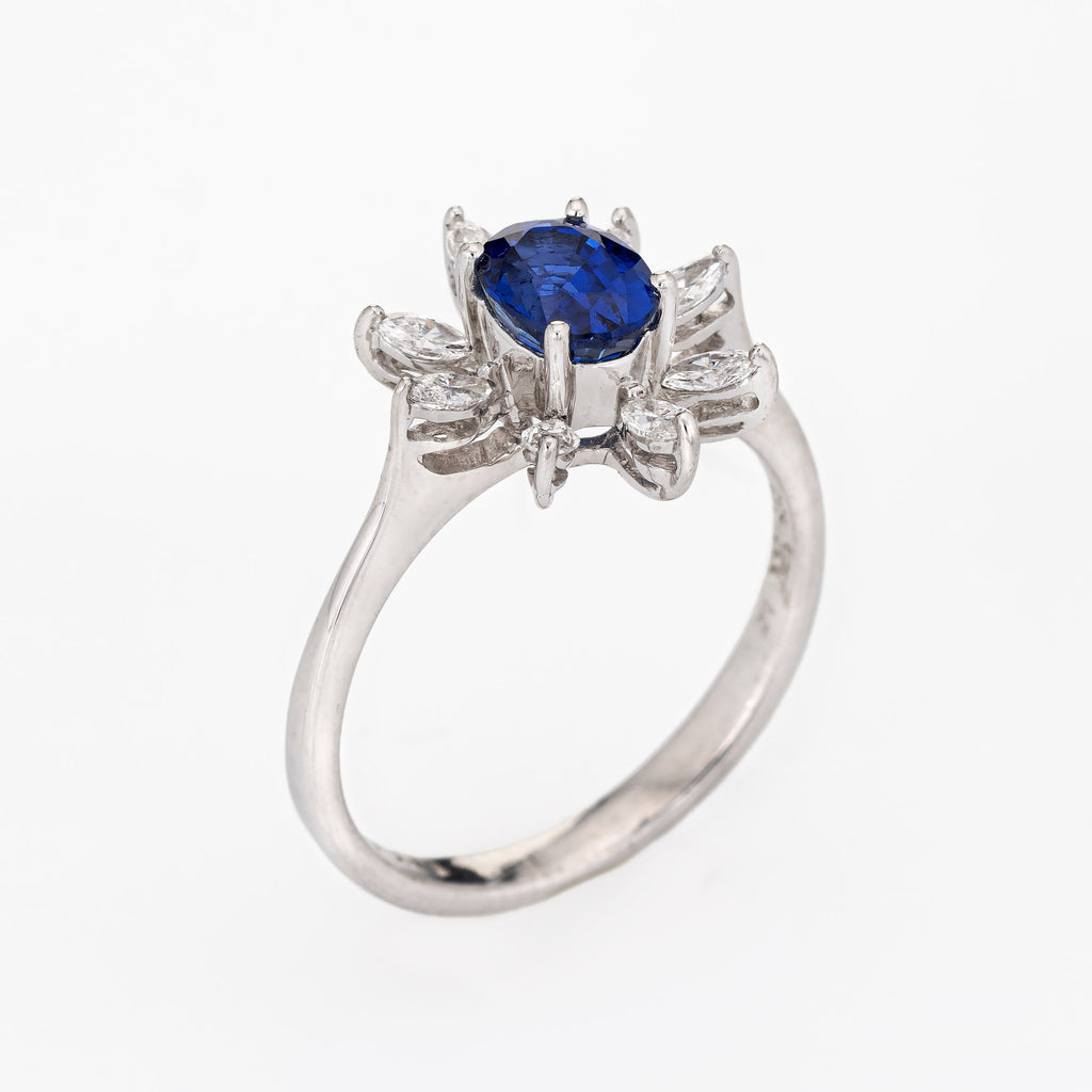 Stones: Oval faceted royal blue sapphire is estimated at 1 carat, accented with 8 marquise cut diamonds that total an estimated 0.36 carats (estimated at H-I color and VS2-SI2 clarity). The sapphire is in excellent condition and free of cracks or chips.