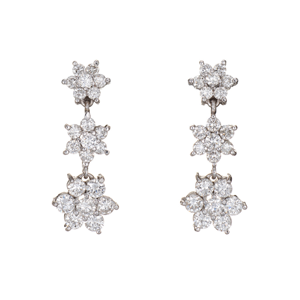 Elegant pair of diamond three tier flower drop earrings crafted in 18k white gold.