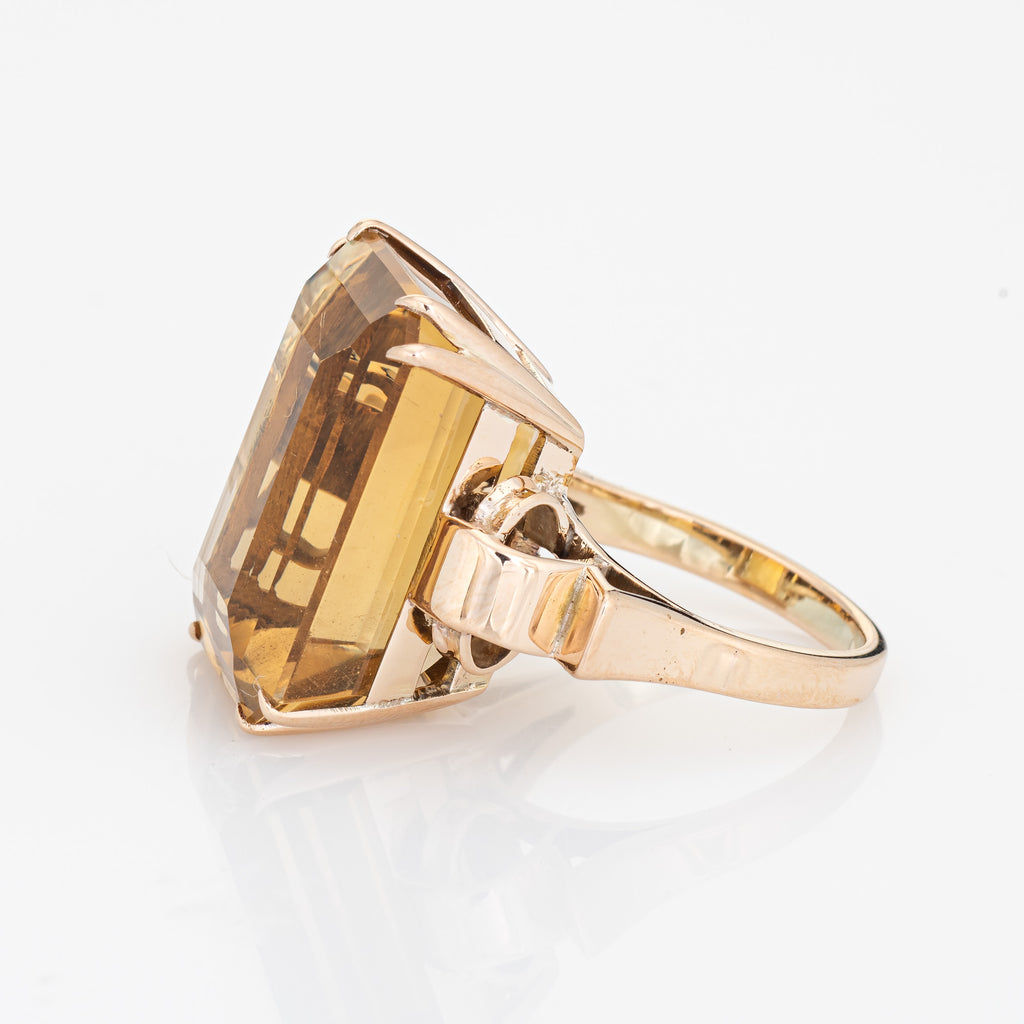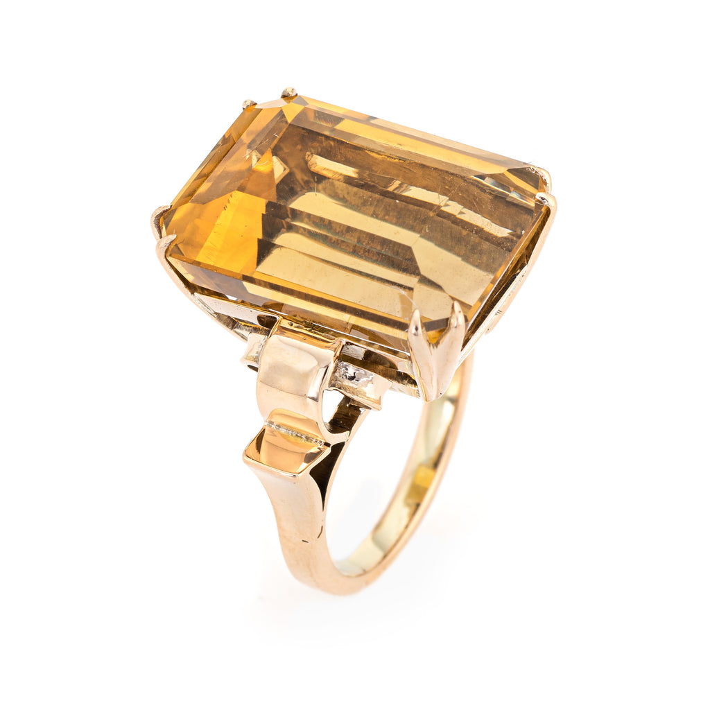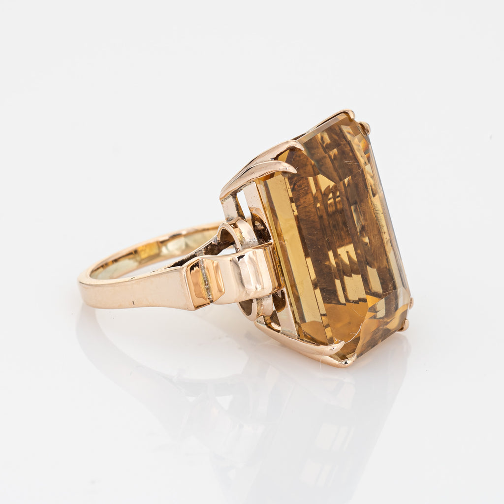 Stylish large estimated 23 carat citrine cocktail ring (circa 1940s to 1950s) crafted in 14 karat yellow gold.