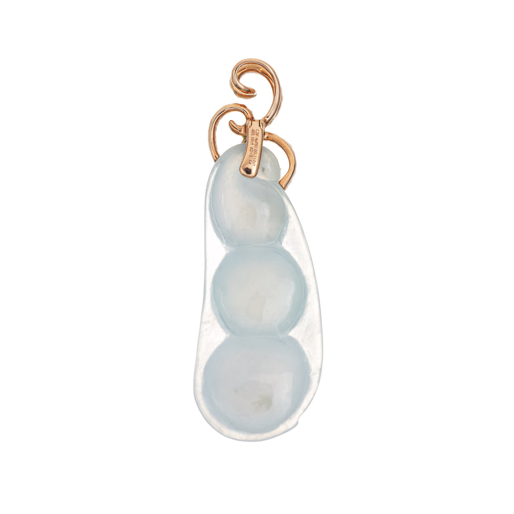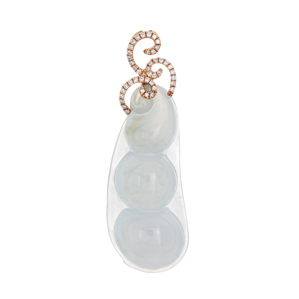 The finely detailed pendant features jade carved in the form of peas in a pod, with three pods cut en-cabochon. Diamonds adorn a scrolled mount. A meaningful piece to honor those close to you.