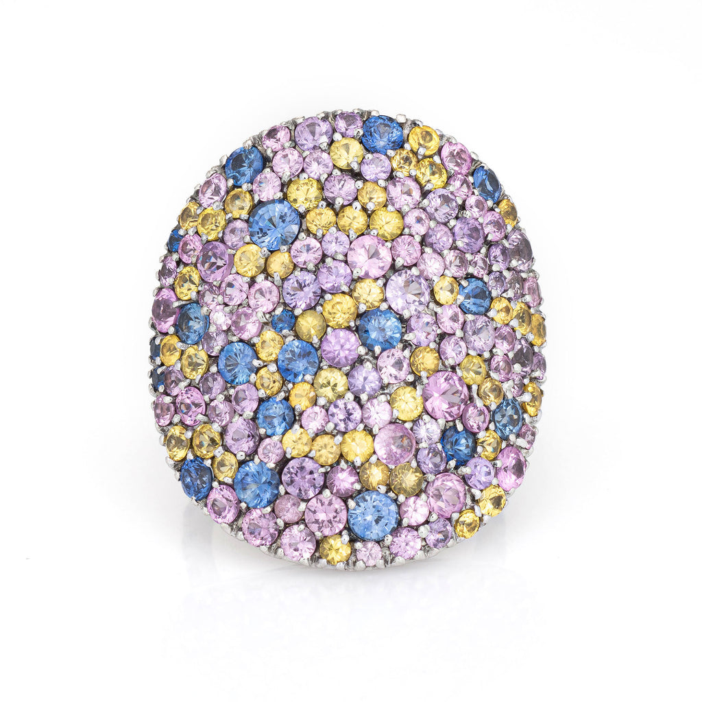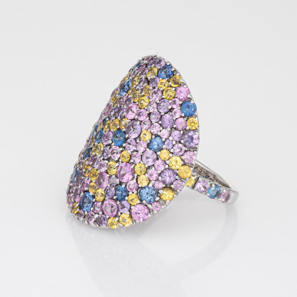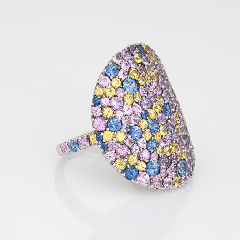 The striking ring is pave set with a colorful mosaic of sapphires in shades of pink, yellow and blue. The rounded oval mount has a curved saddle and sits comfortably on the finger. The ring makes a bold, colorful statement on the hand. The mount has a medium rise (7mm - 0.27 inches). The ring is in very good condition and was recently professionally cleaned and polished.