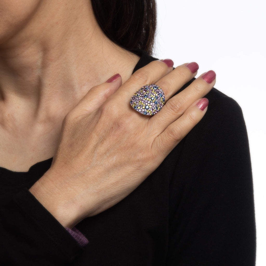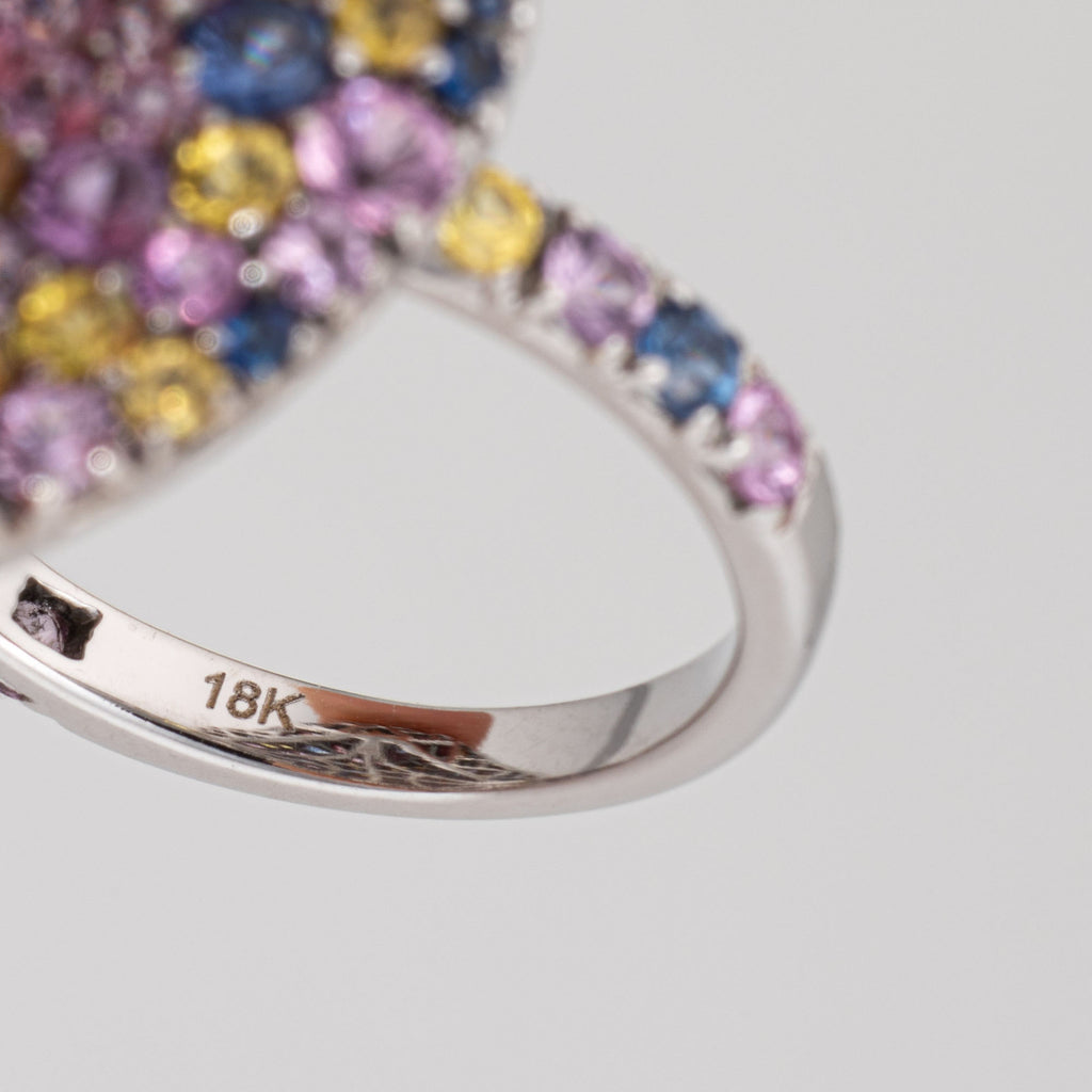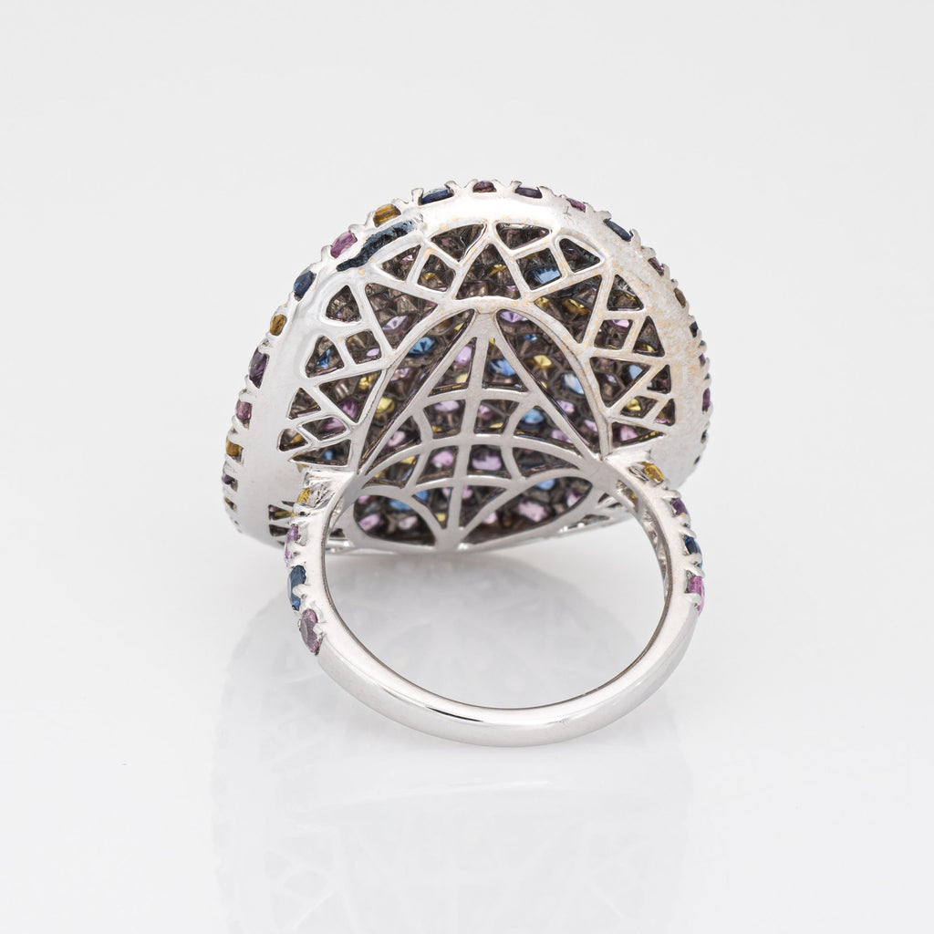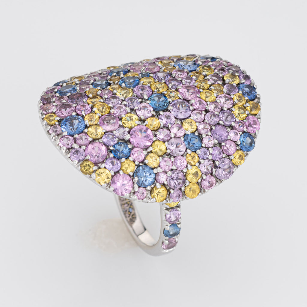 The striking ring is pave set with a colorful mosaic of sapphires in shades of pink, yellow and blue. The rounded oval mount has a curved saddle and sits comfortably on the finger. The ring makes a bold, colorful statement on the hand. The mount has a medium rise (7mm - 0.27 inches). The ring is in very good condition and was recently professionally cleaned and polished.