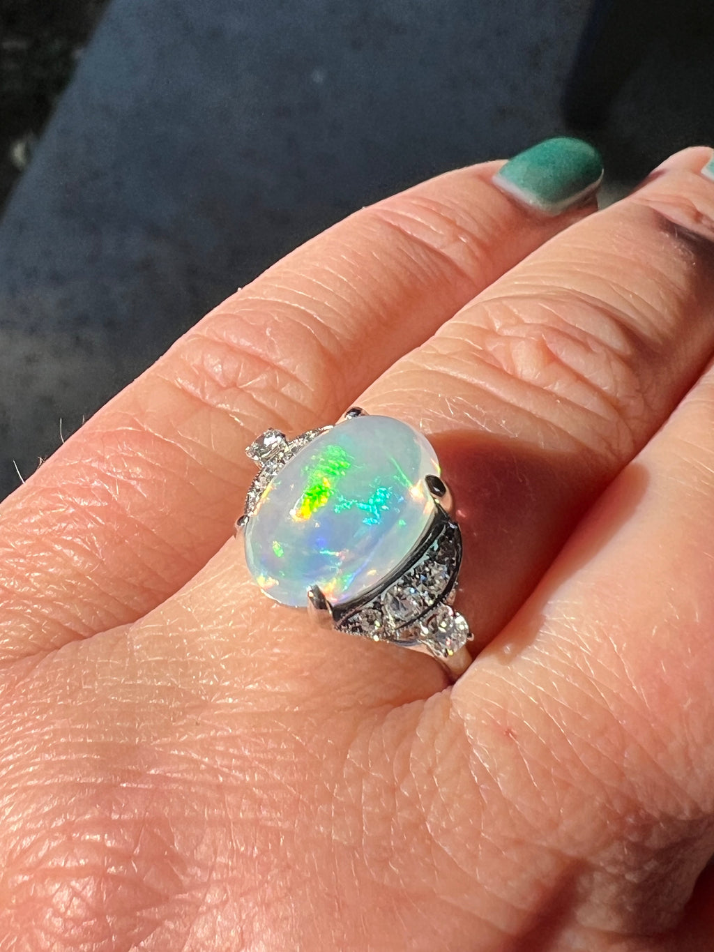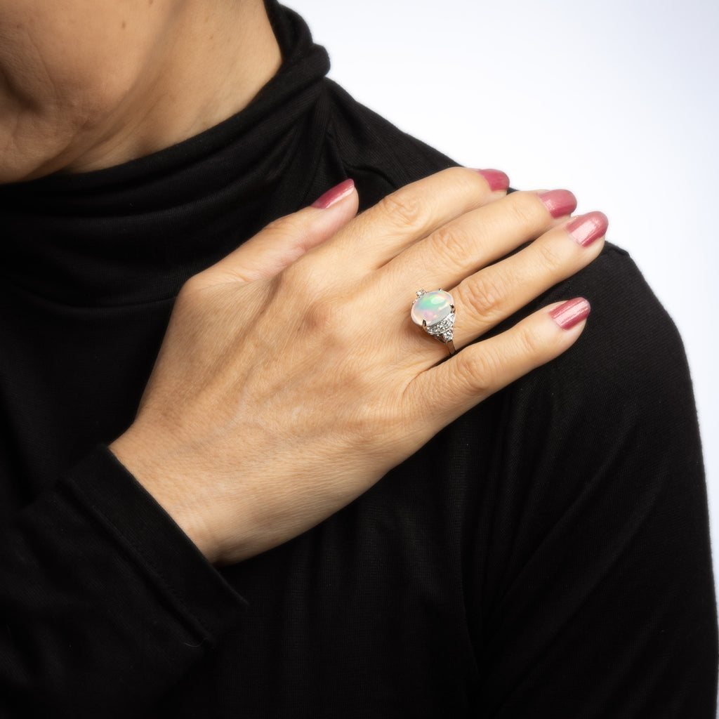 Stones: Cabochon cut natural jelly opal, 4.92 carats (11.40 x 9mm x 9.3mm). The opal  is in excellent condition and free of cracks or chips. The opal exhibits a strong play of colors from blue to green, turquoise, orange yellow and bits of red. Surrounding the opal is 10 full cut & single cut diamonds, total weight approx. 0.25ct, G-H color, VS-SI qualities, good cuts.