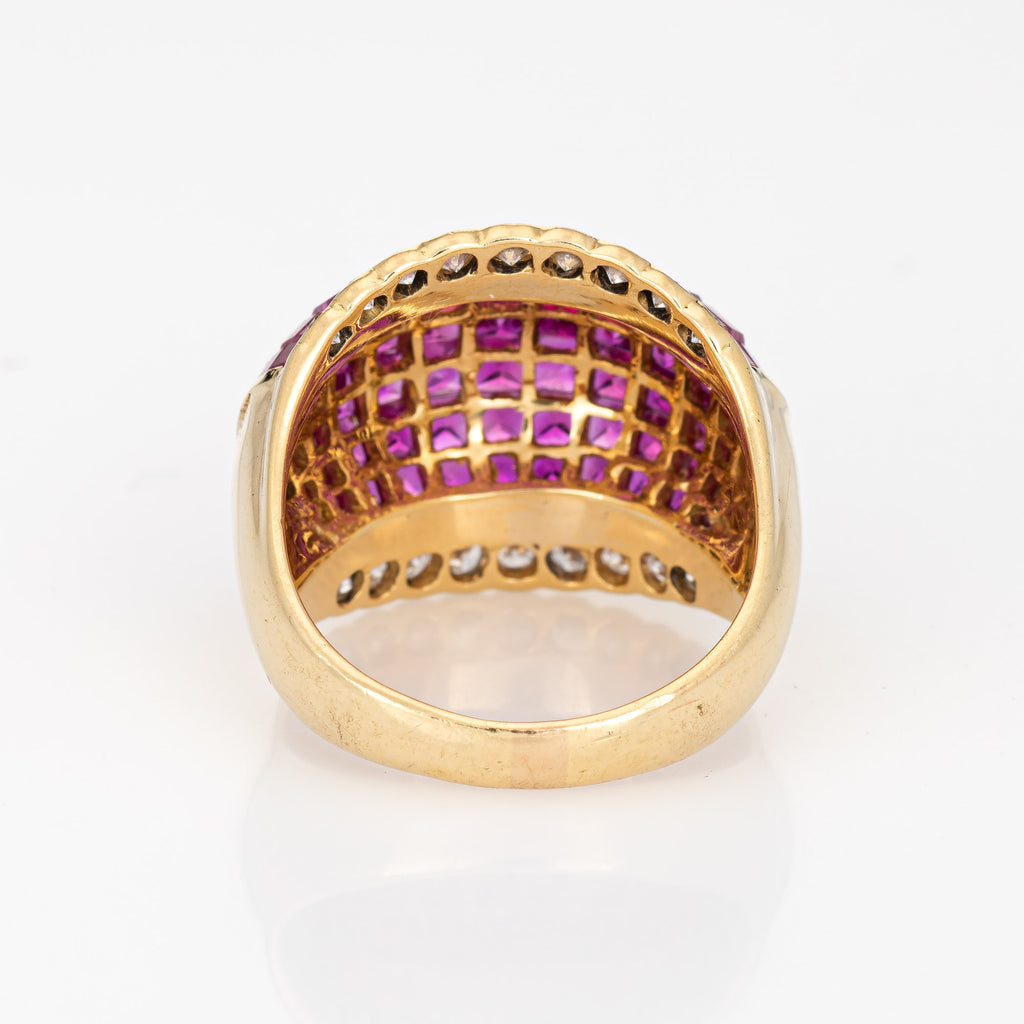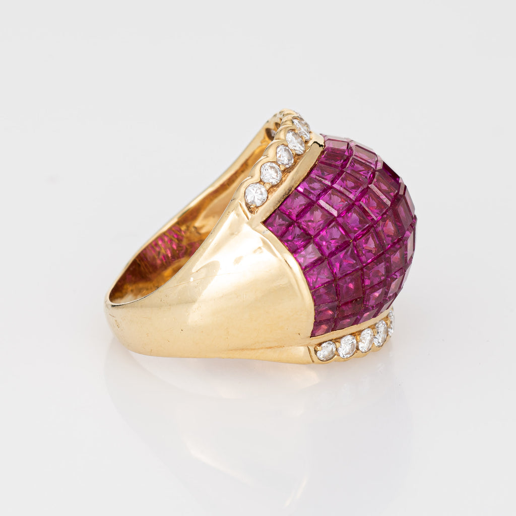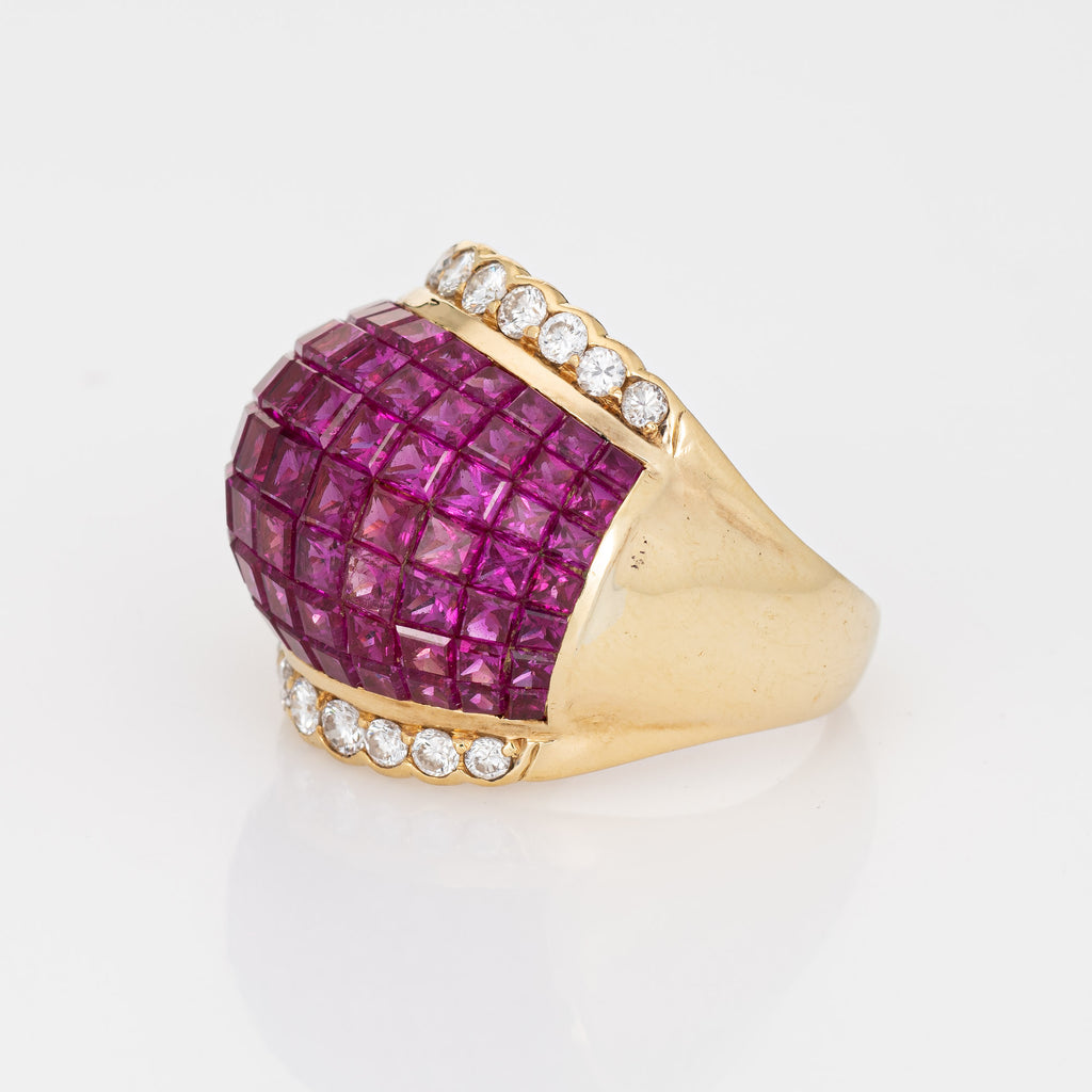 Stylish vintage invisible set ruby & diamond ring (circa 1980s to 1990s) crafted in 18 karat yellow gold.