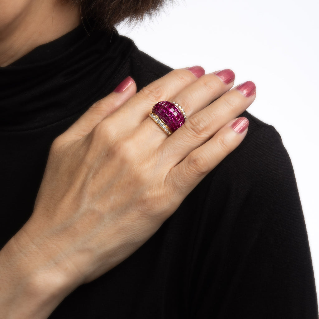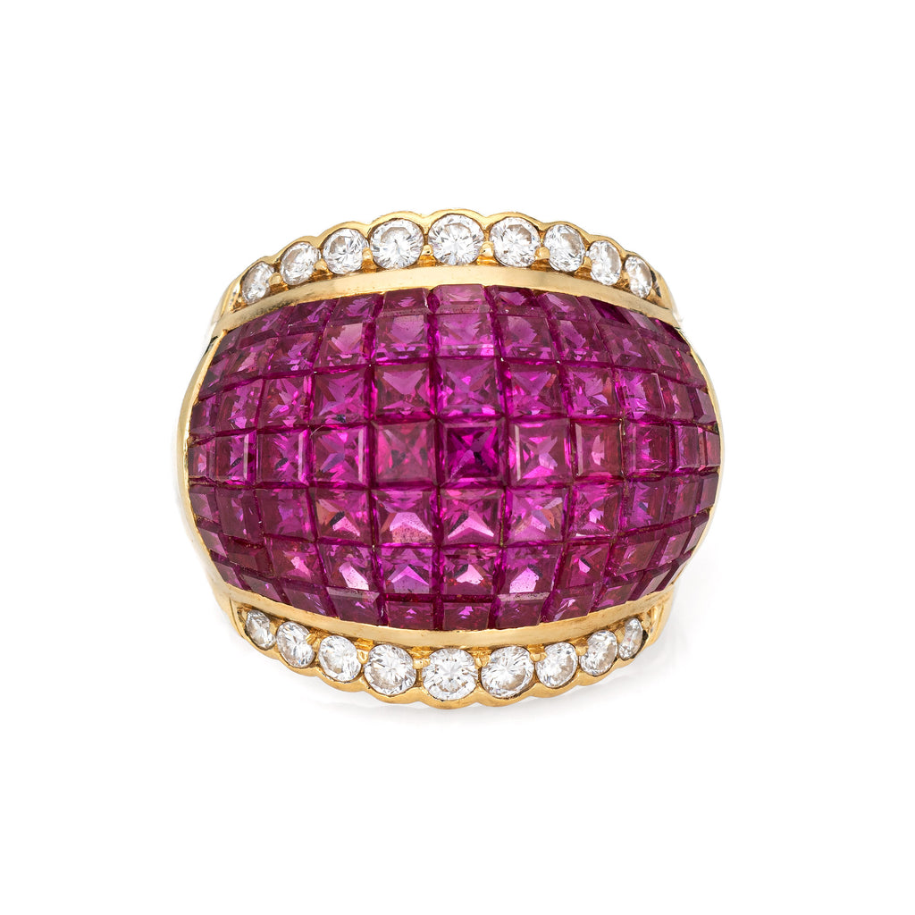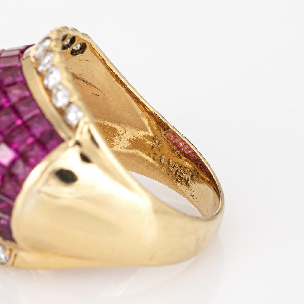 Stylish vintage invisible set ruby & diamond ring (circa 1980s to 1990s) crafted in 18 karat yellow gold.
