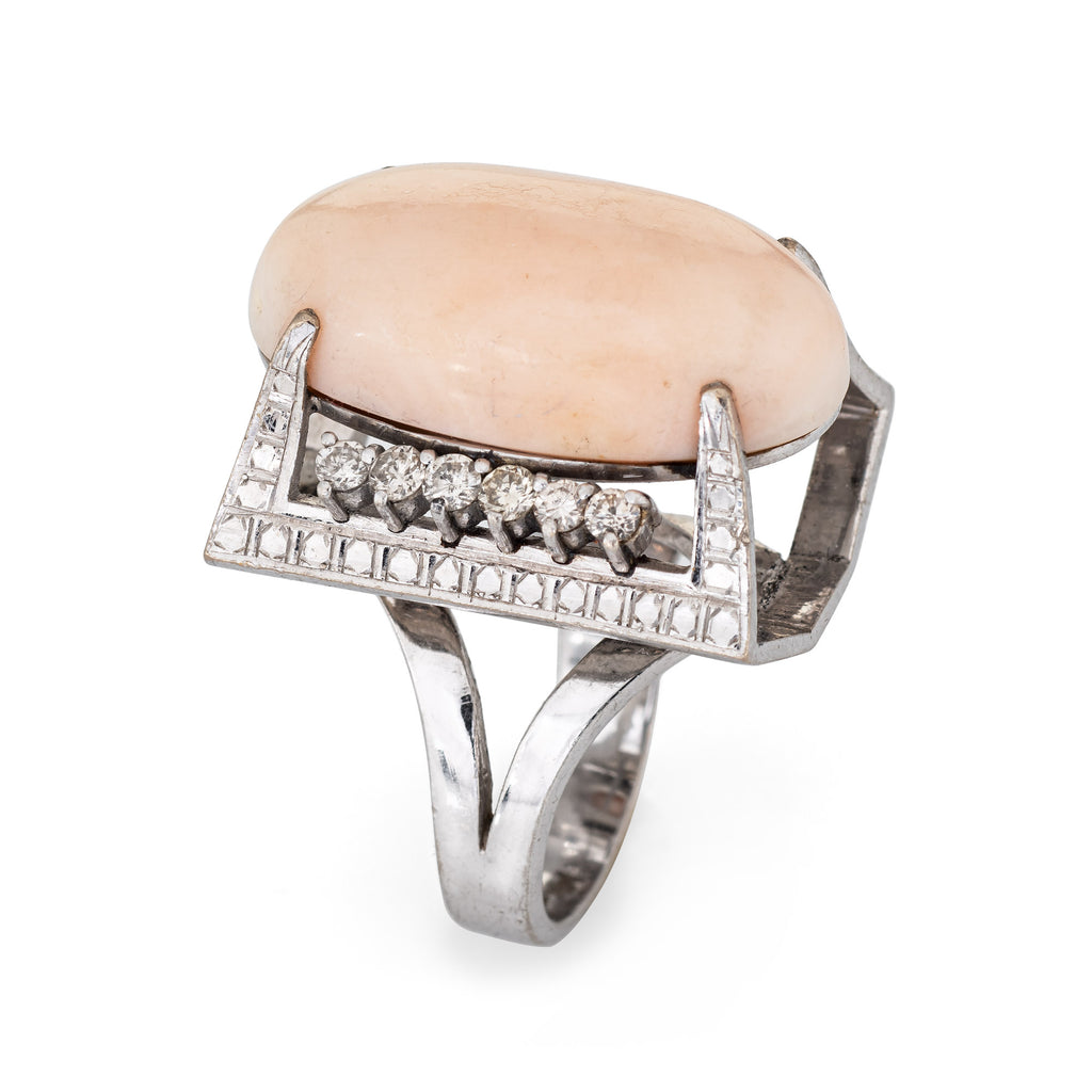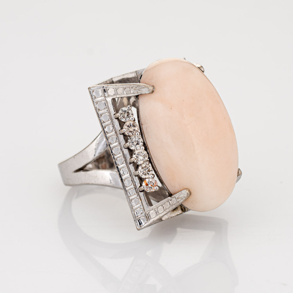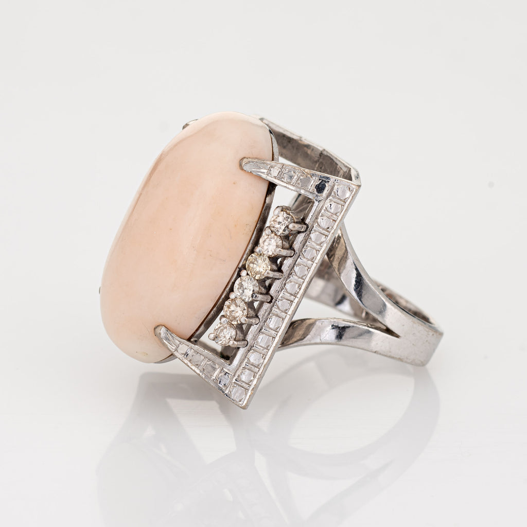 Stylish vintage angel skin coral & diamond ring (circa 1960s) crafted in 14 karat white gold.