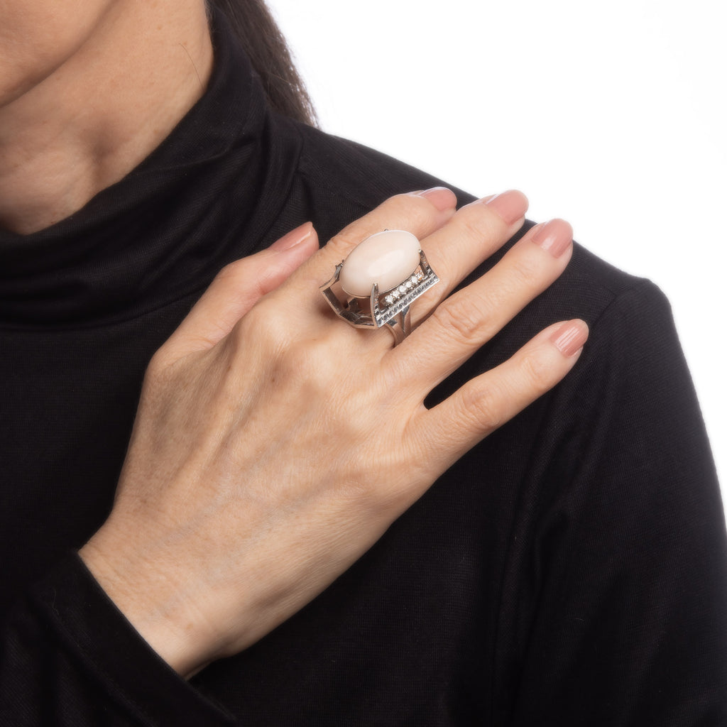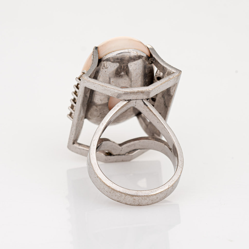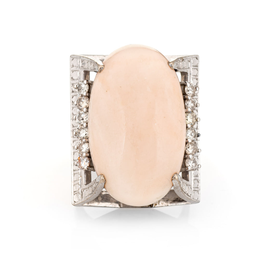 Stylish vintage angel skin coral & diamond ring (circa 1960s) crafted in 14 karat white gold.