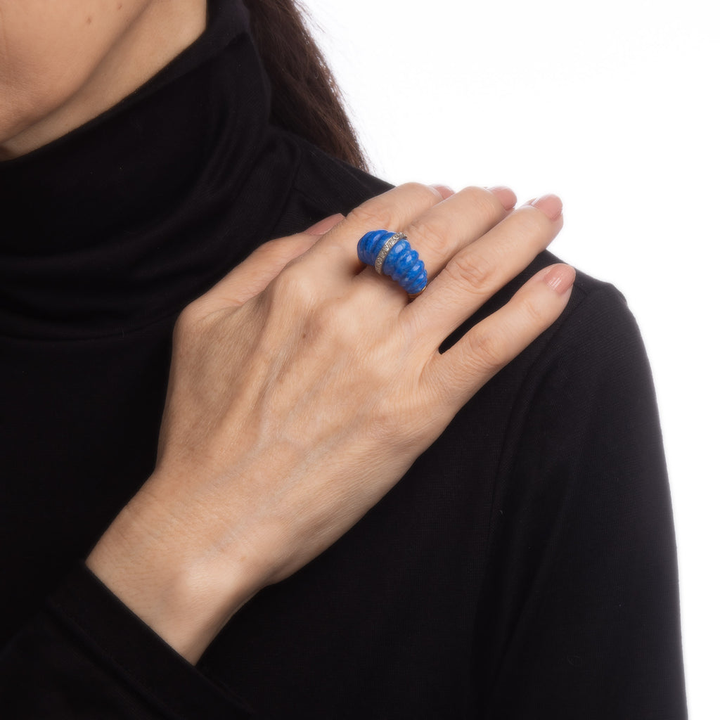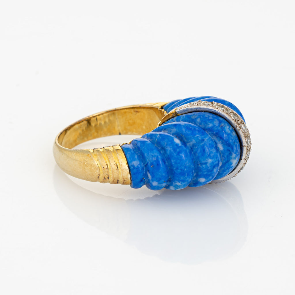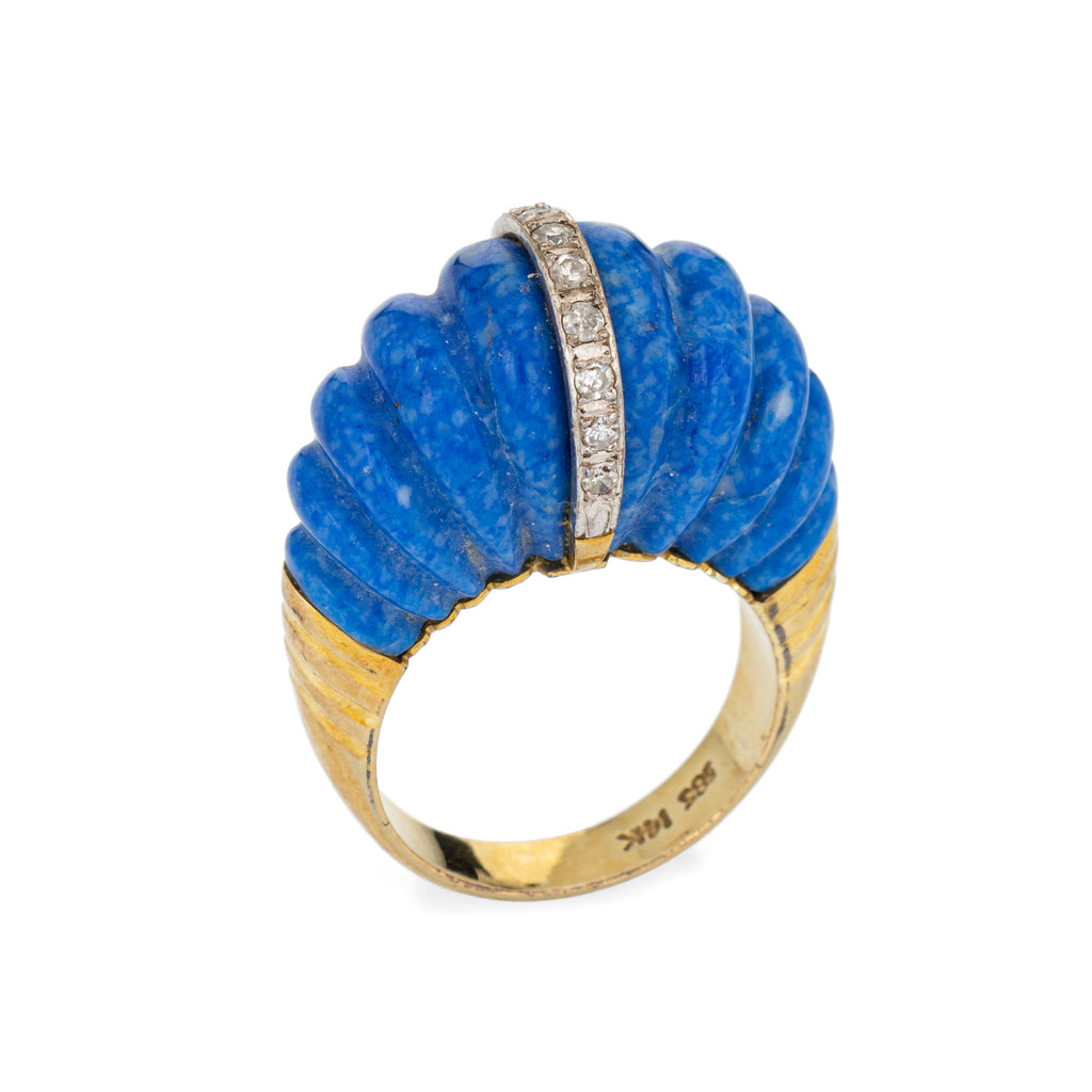 The high dome fluted lapis lazuli is set with a strand of diamonds to the center. A striking cocktail ring that makes a nice statement on the hand. A popular style during the 1960s that has great appeal today. The high rise ring (15mm - 0.59 inches) sits comfortably on the finger.