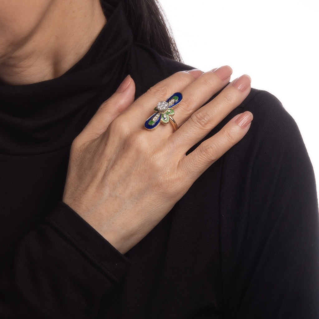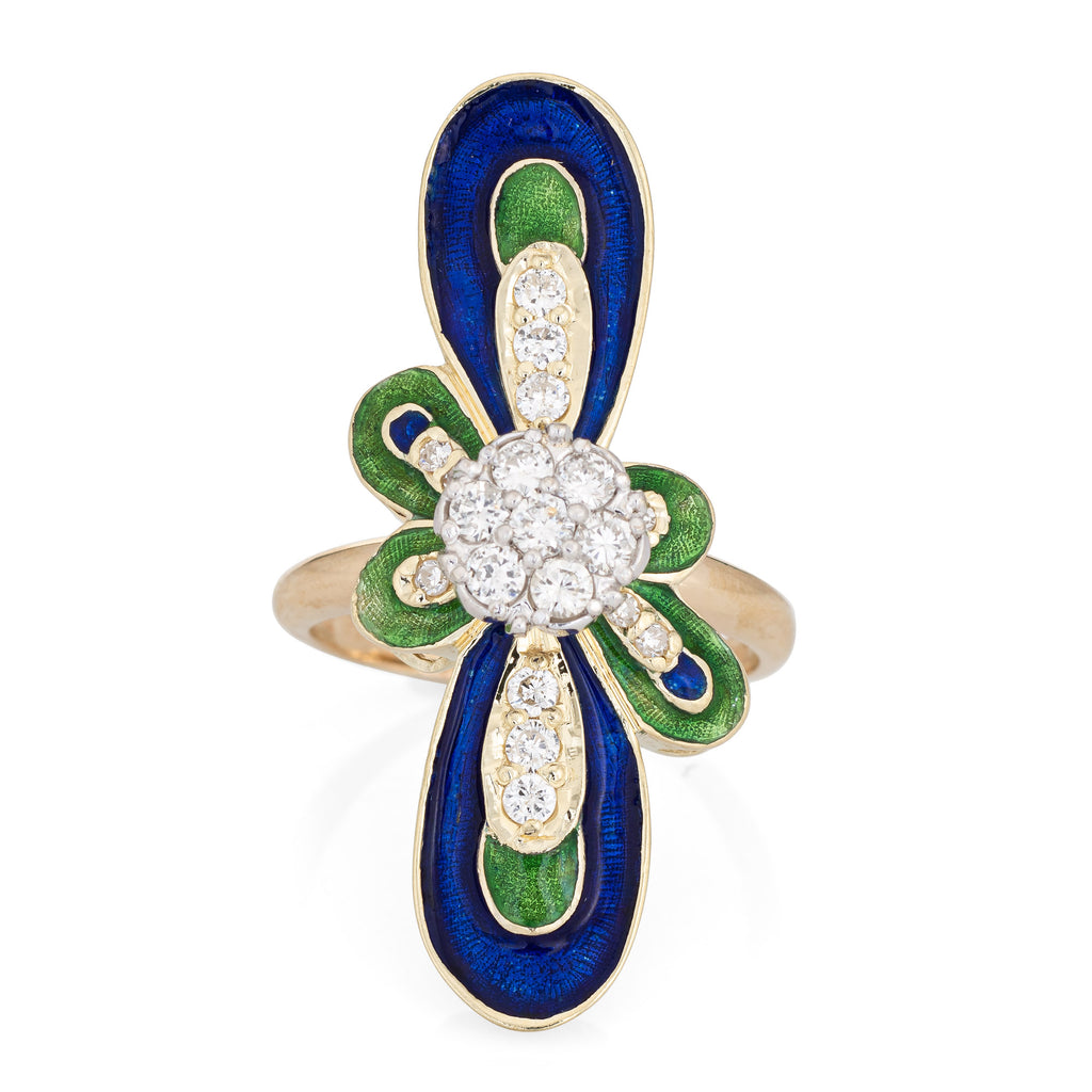 The bold and groovy ring highlights bright and lively green and blue enamel set into a long 1.45 inch elongated mount. With a cluster of diamonds set to the center, the ring makes great statement on the hand. The low rise ring (10mm - 0.39 inches) sits comfortably on the finger.