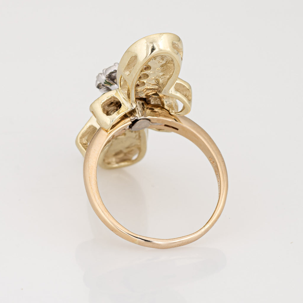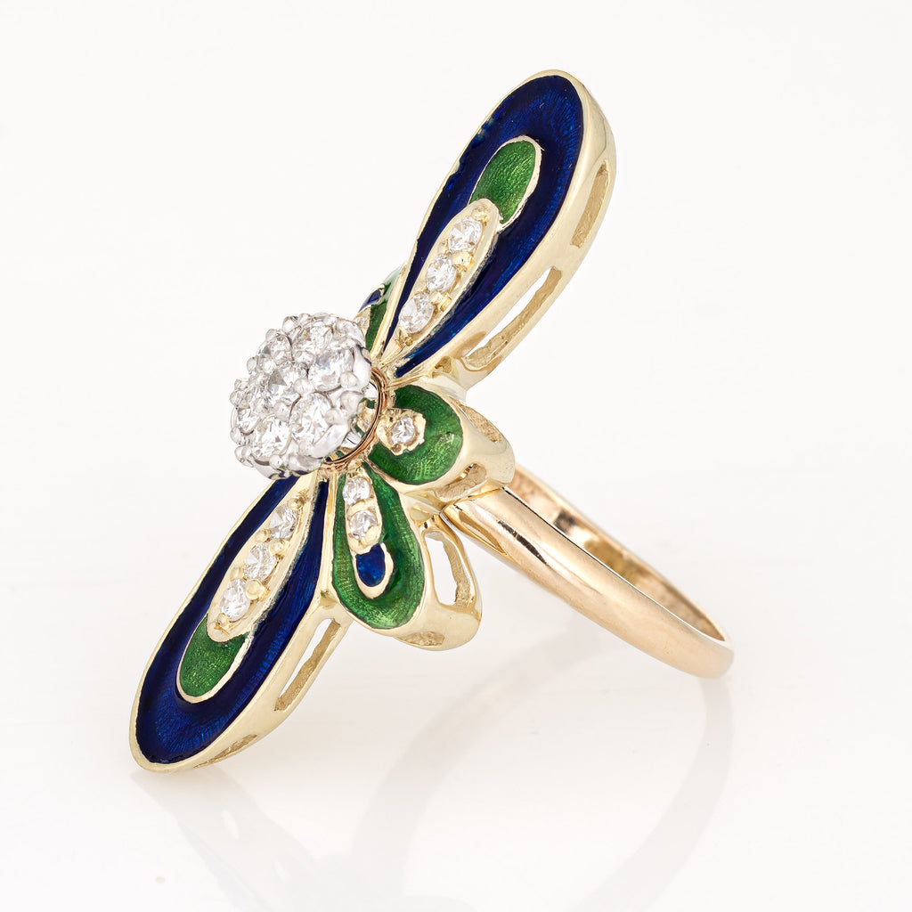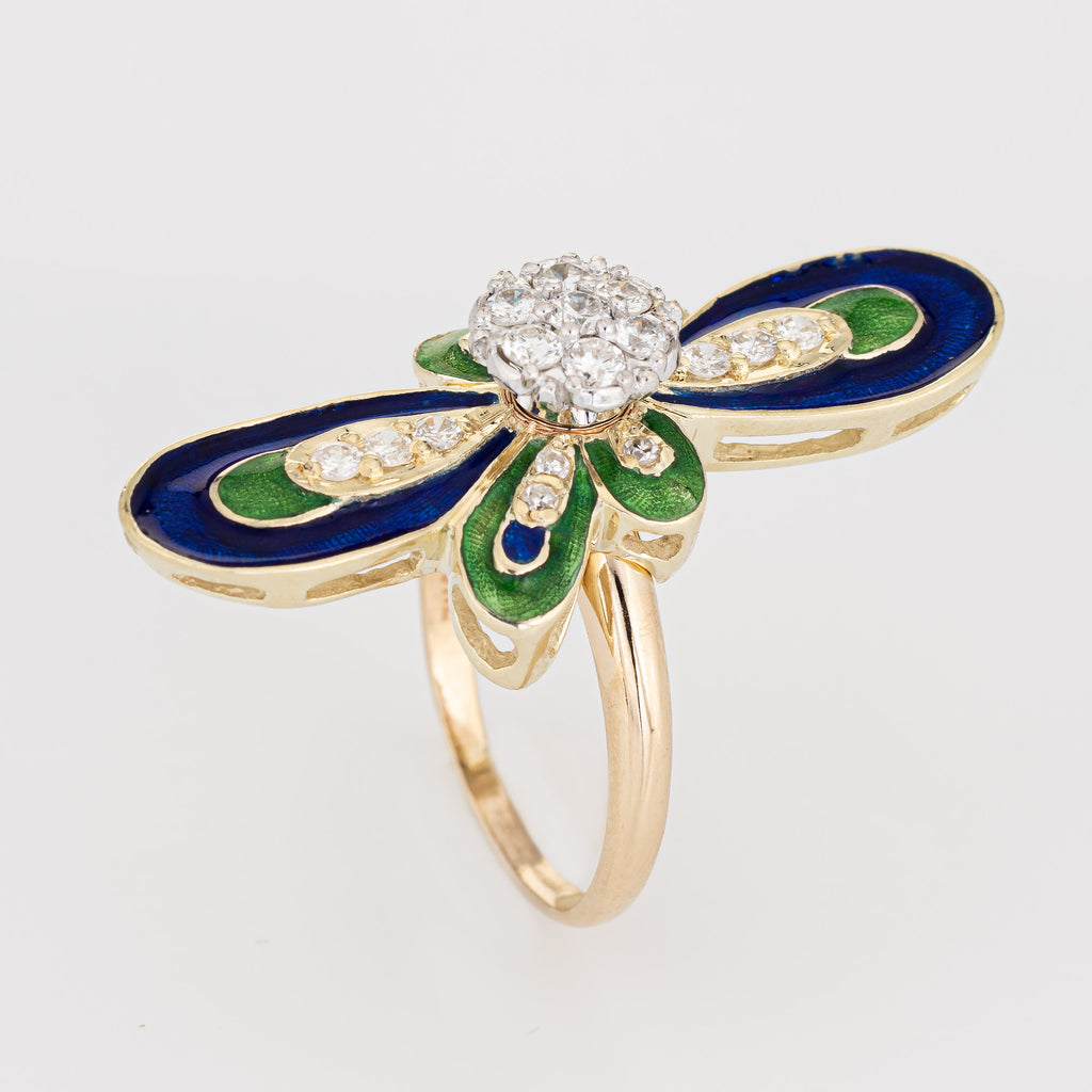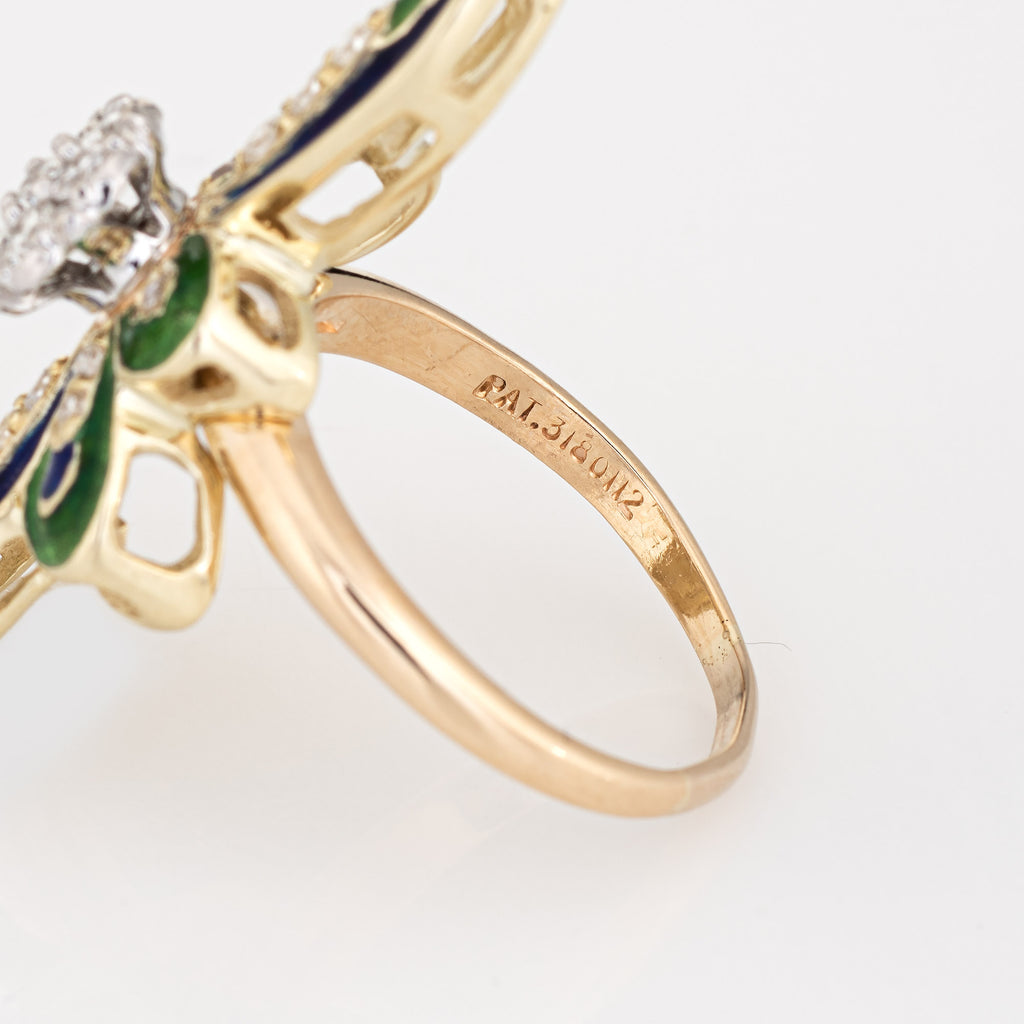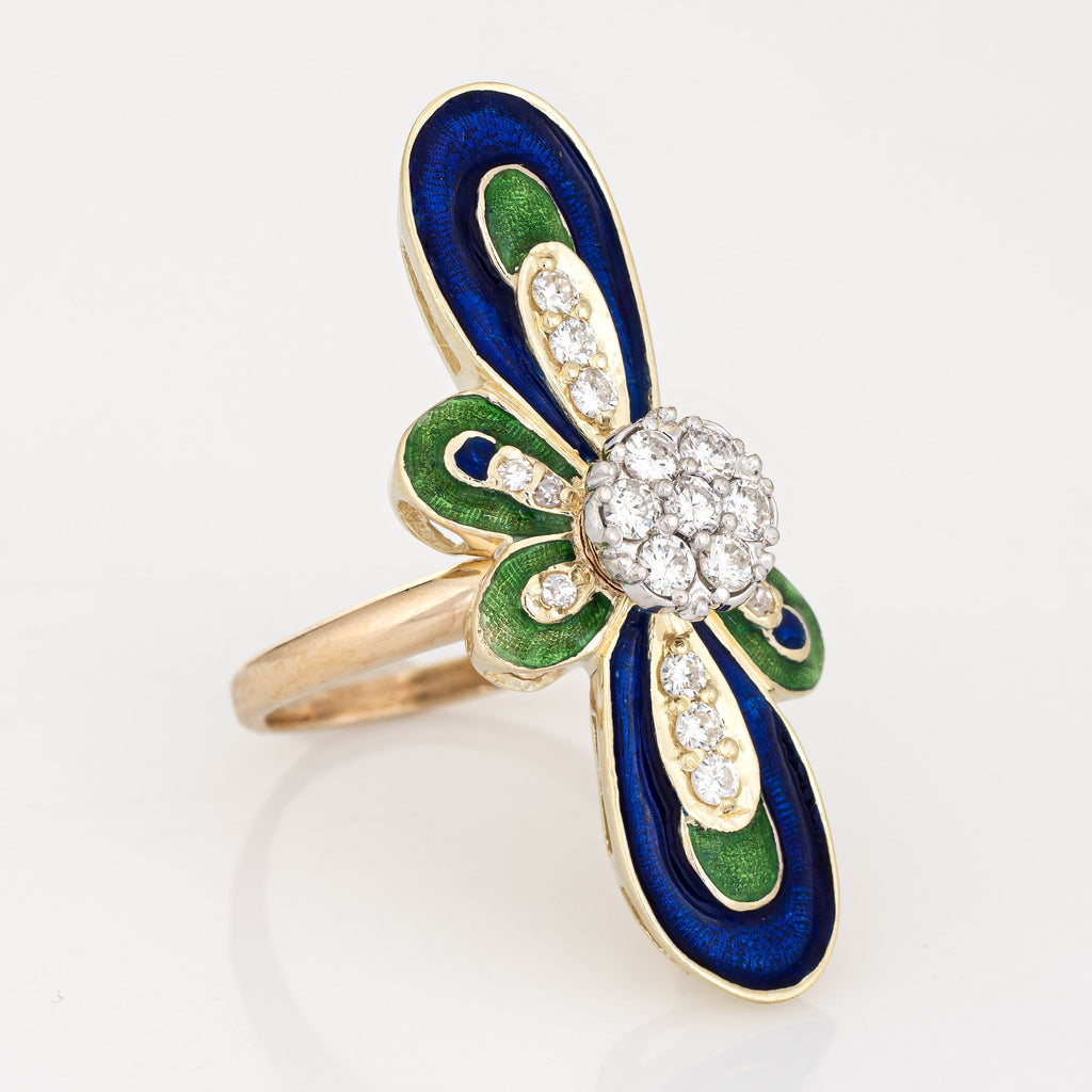 60s Vintage Enamel Diamond Ring 14k Yellow Gold Long Cocktail Sz 7.25 Jewelry