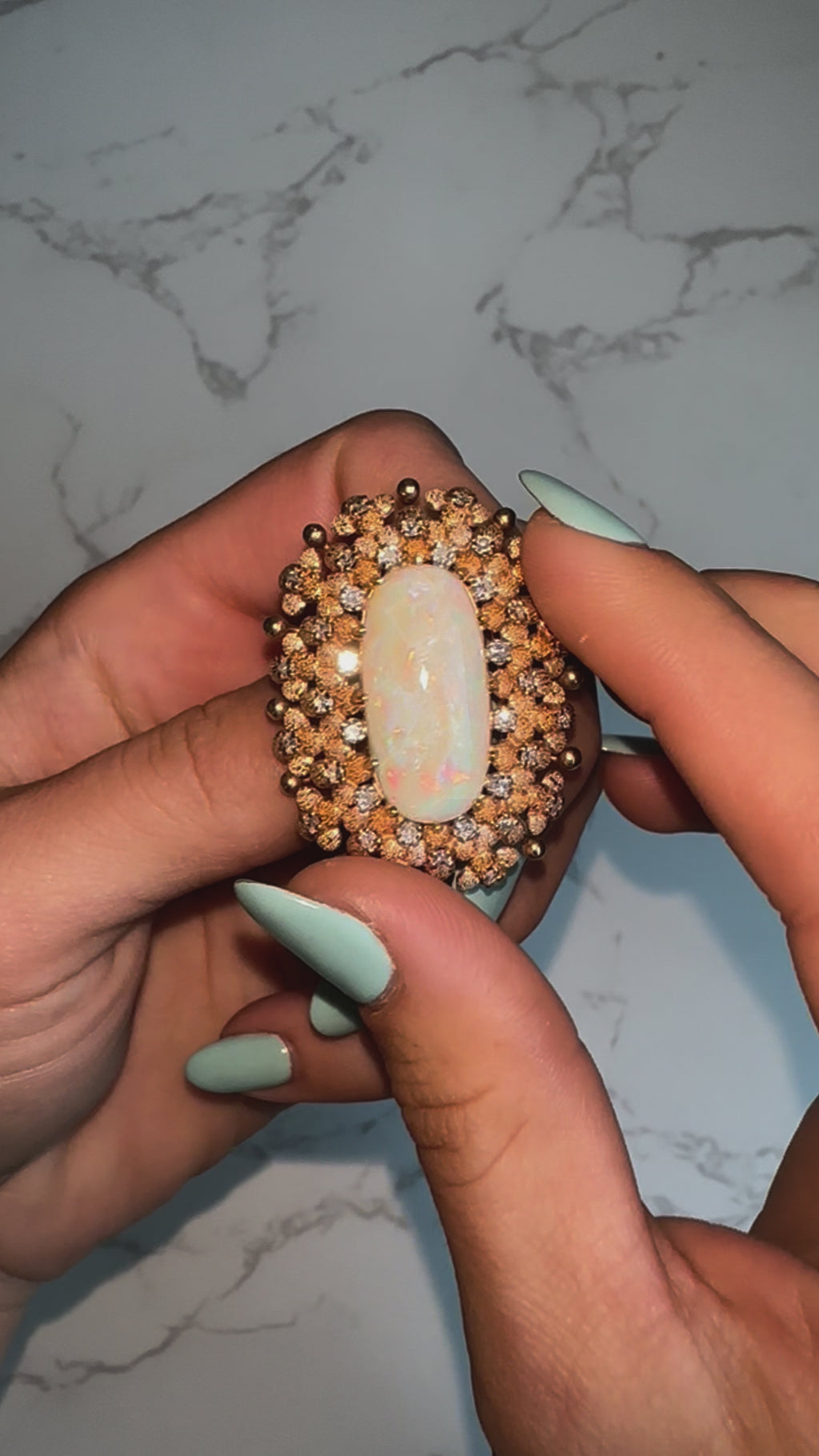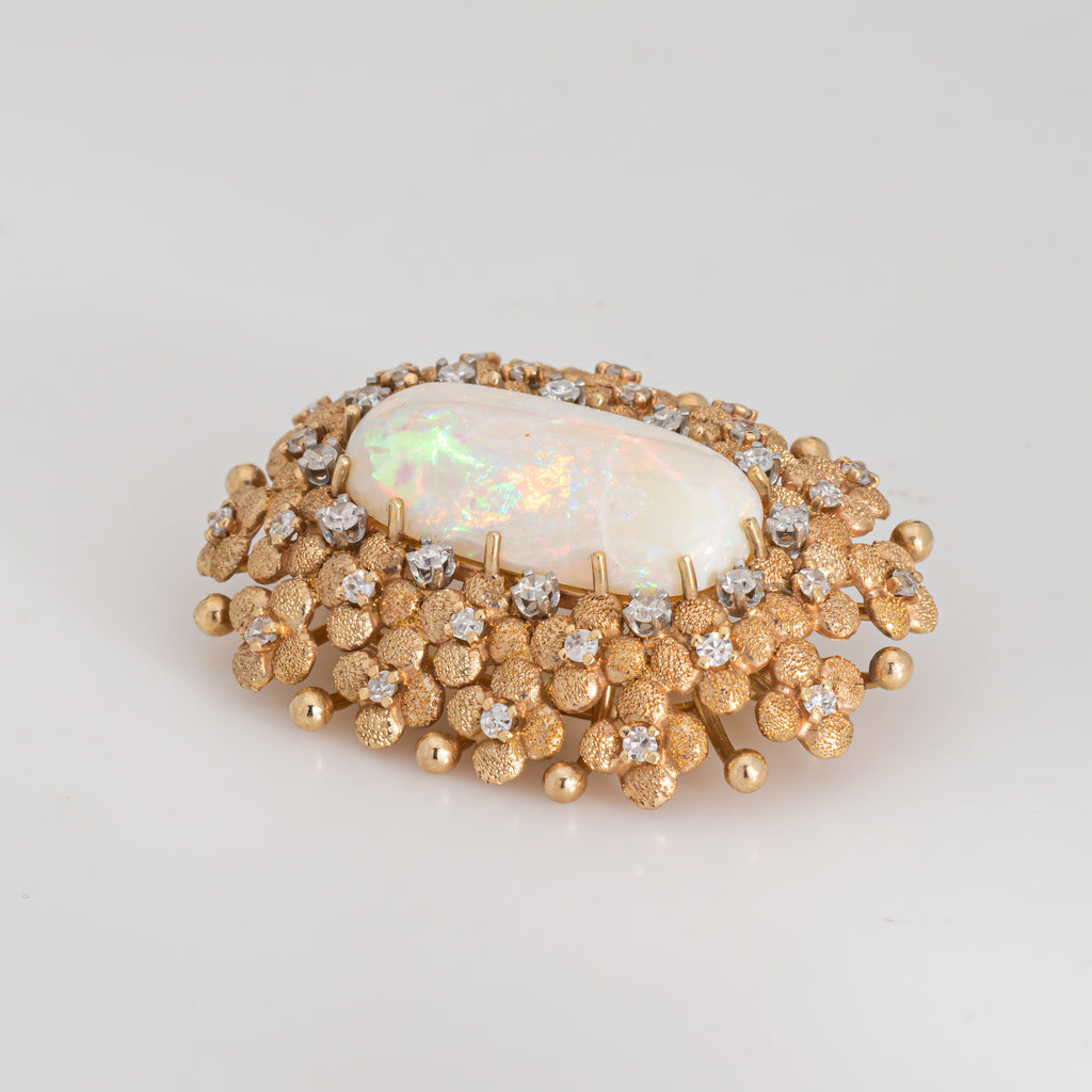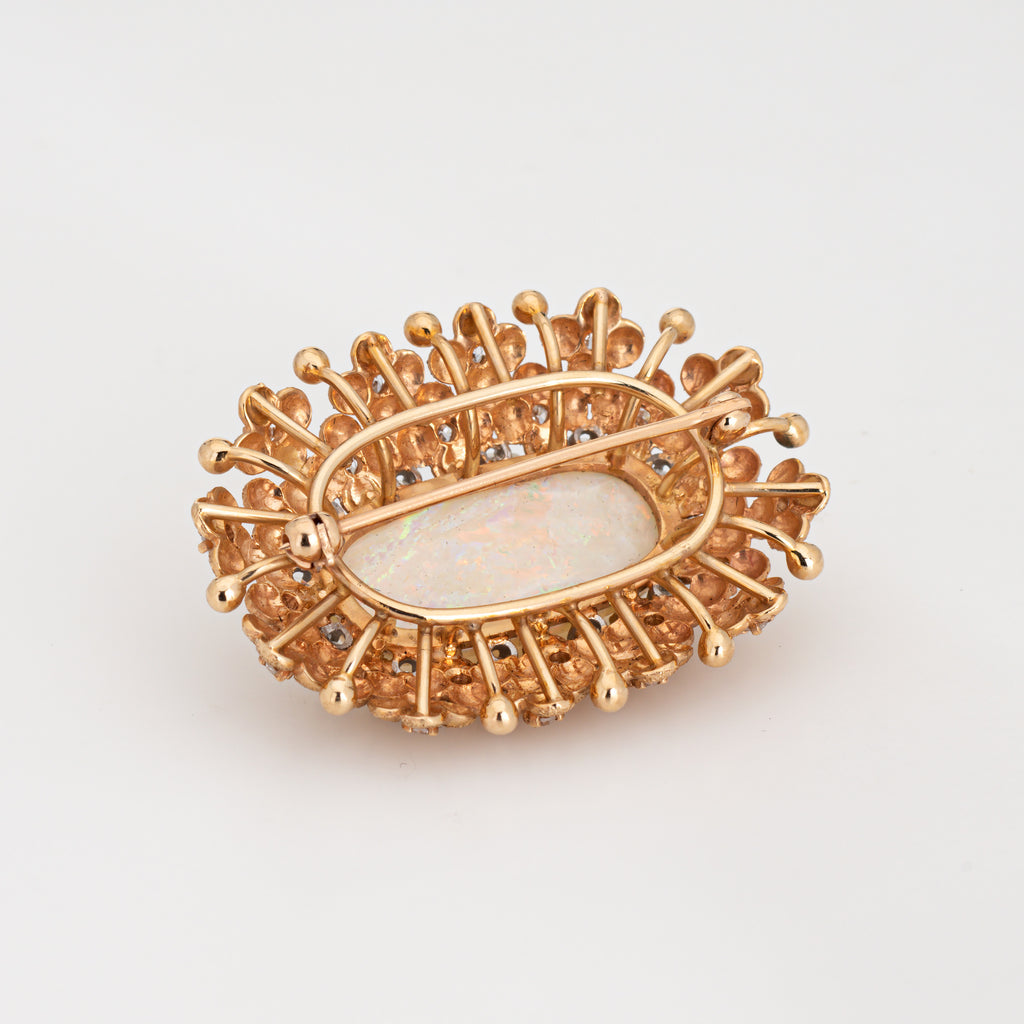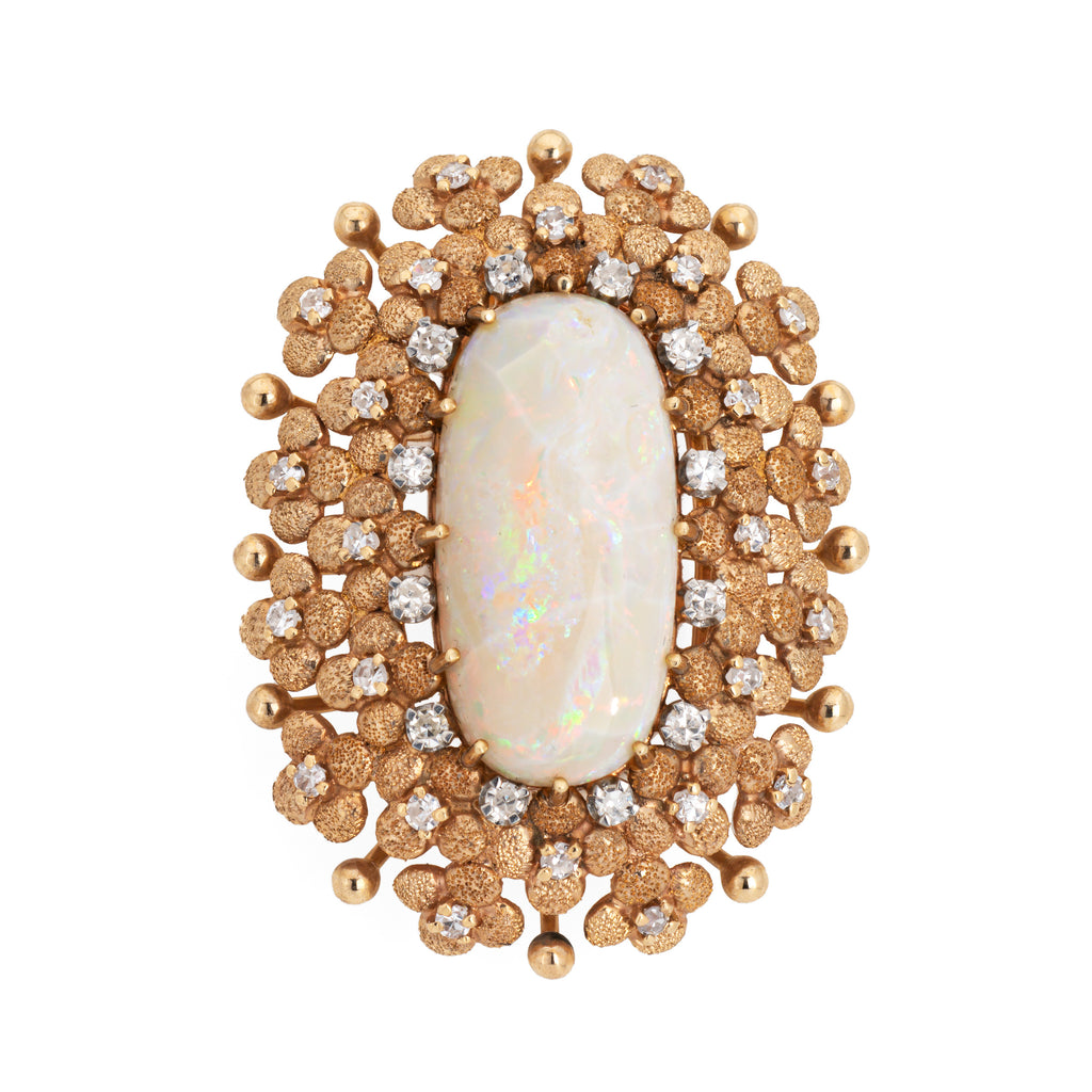 Stylish and finely detailed large opal & diamond brooch crafted in 14 karat yellow gold (circa 1960s).