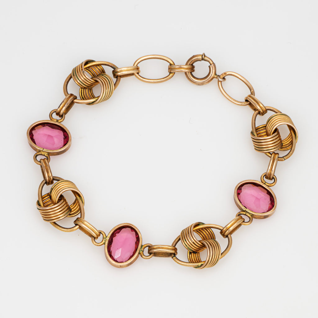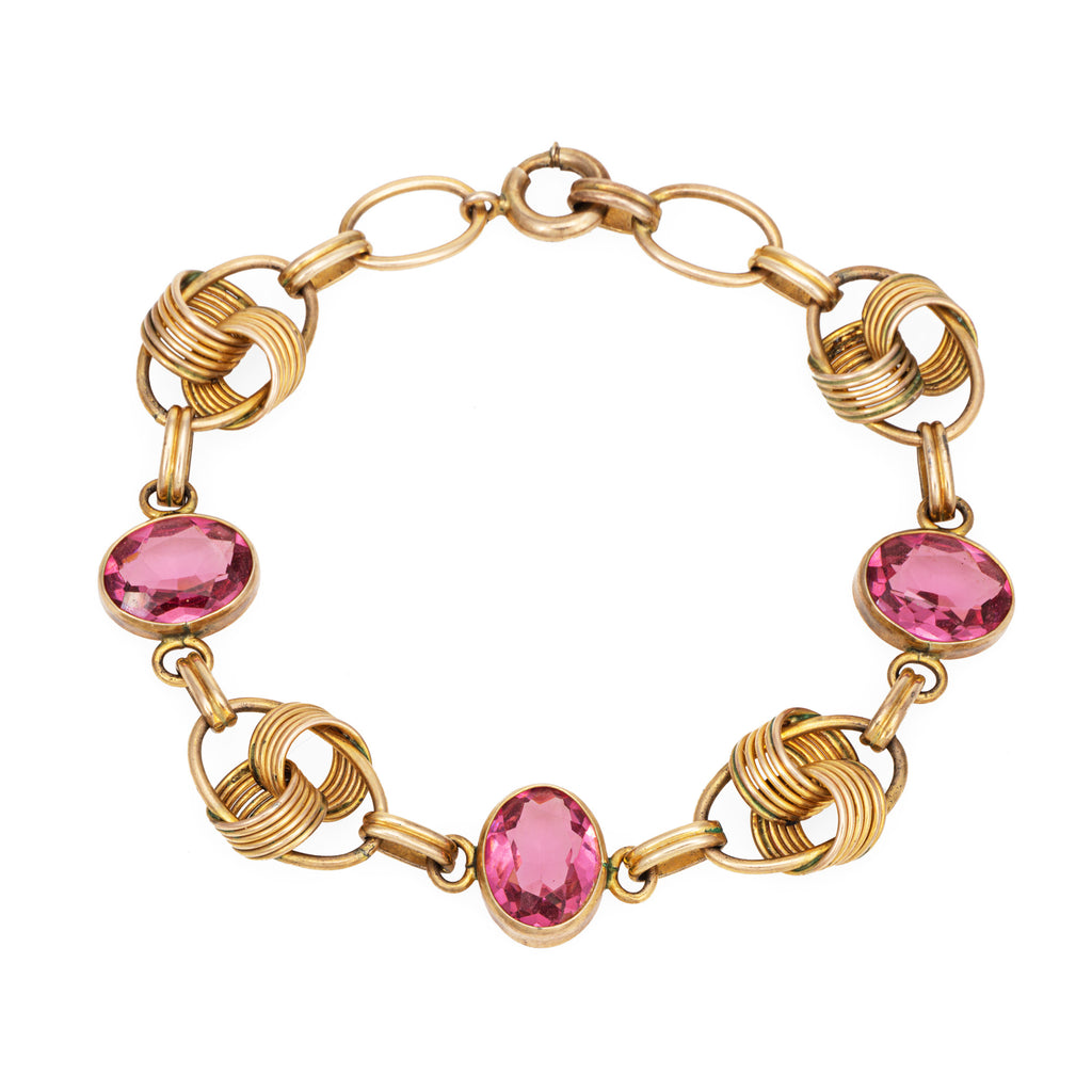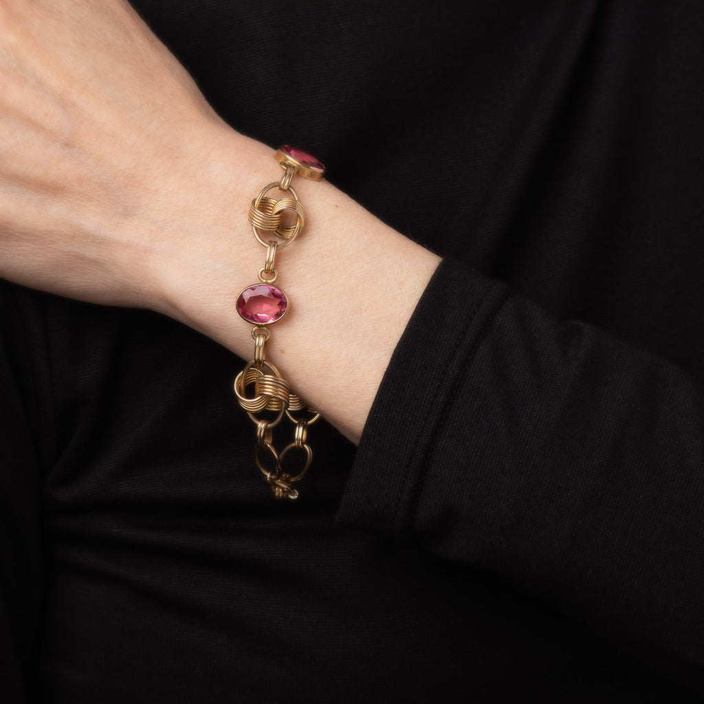 The bracelet highlights beautiful pink tourmalines, bezel set within oval infinity links. The bracelet is great worn alone or layered with your fine jewelry from any era.