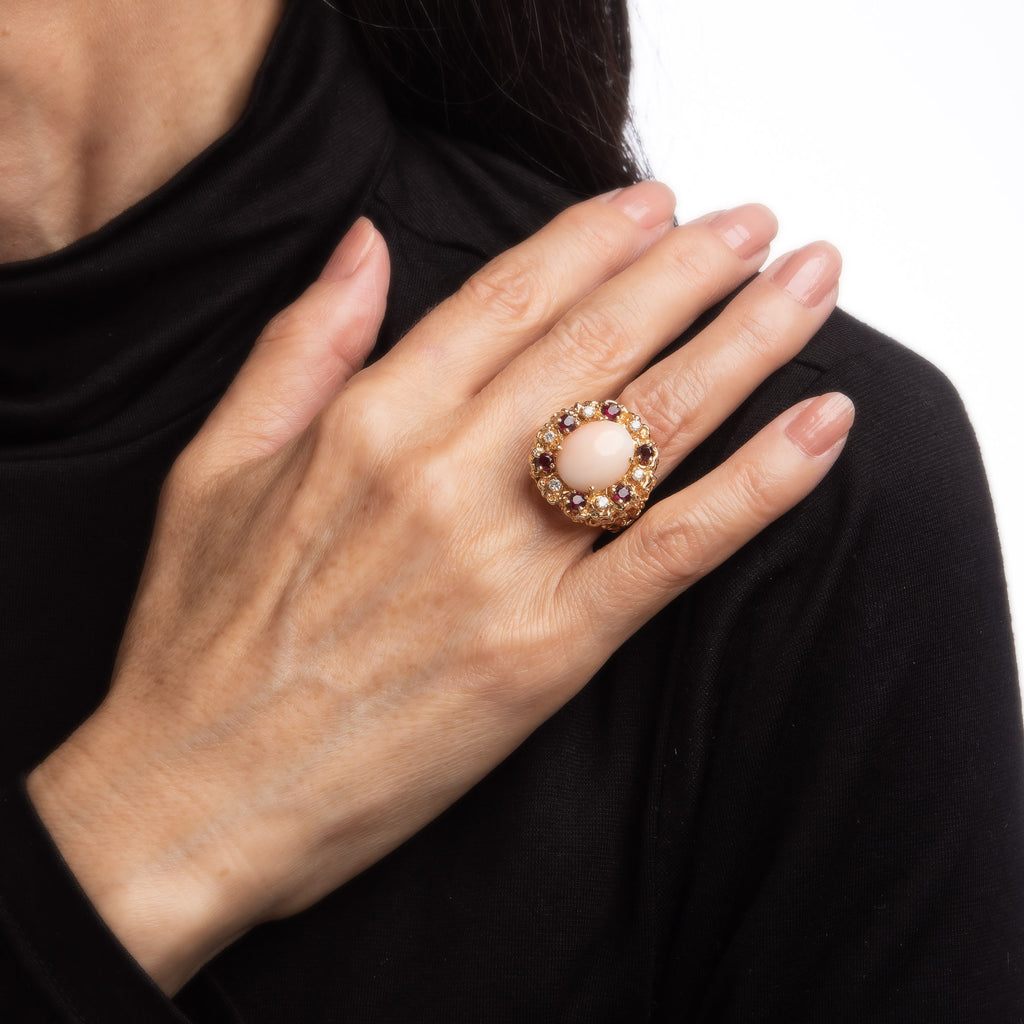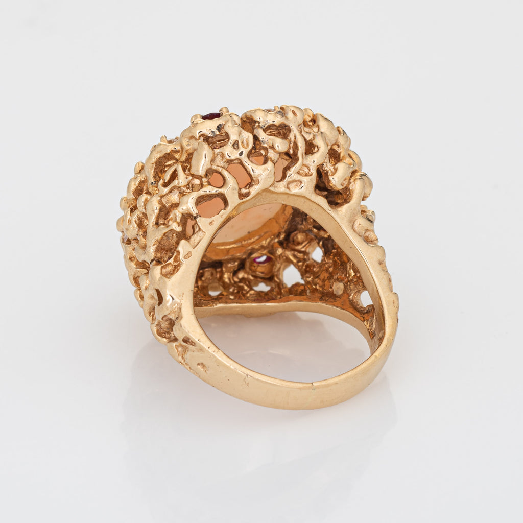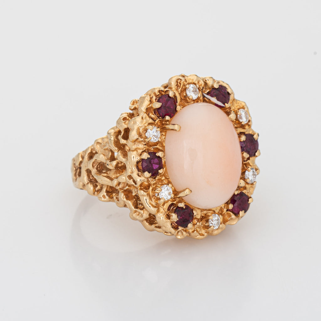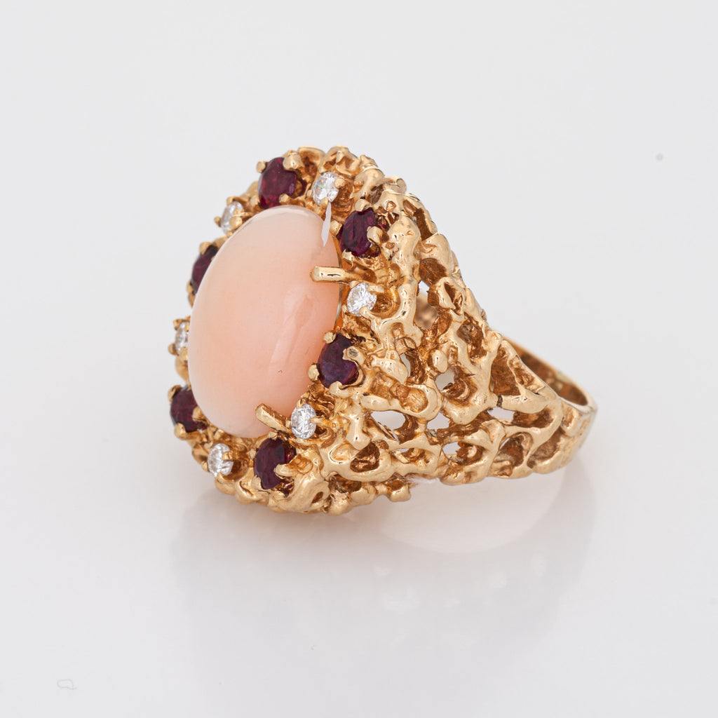 Stylish vintage angel skin coral, ruby & diamond ring (circa 1970s) crafted in 14 karat yellow gold.