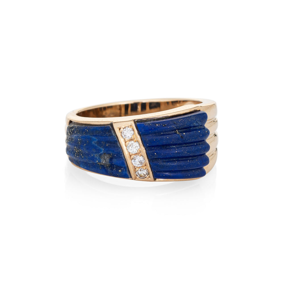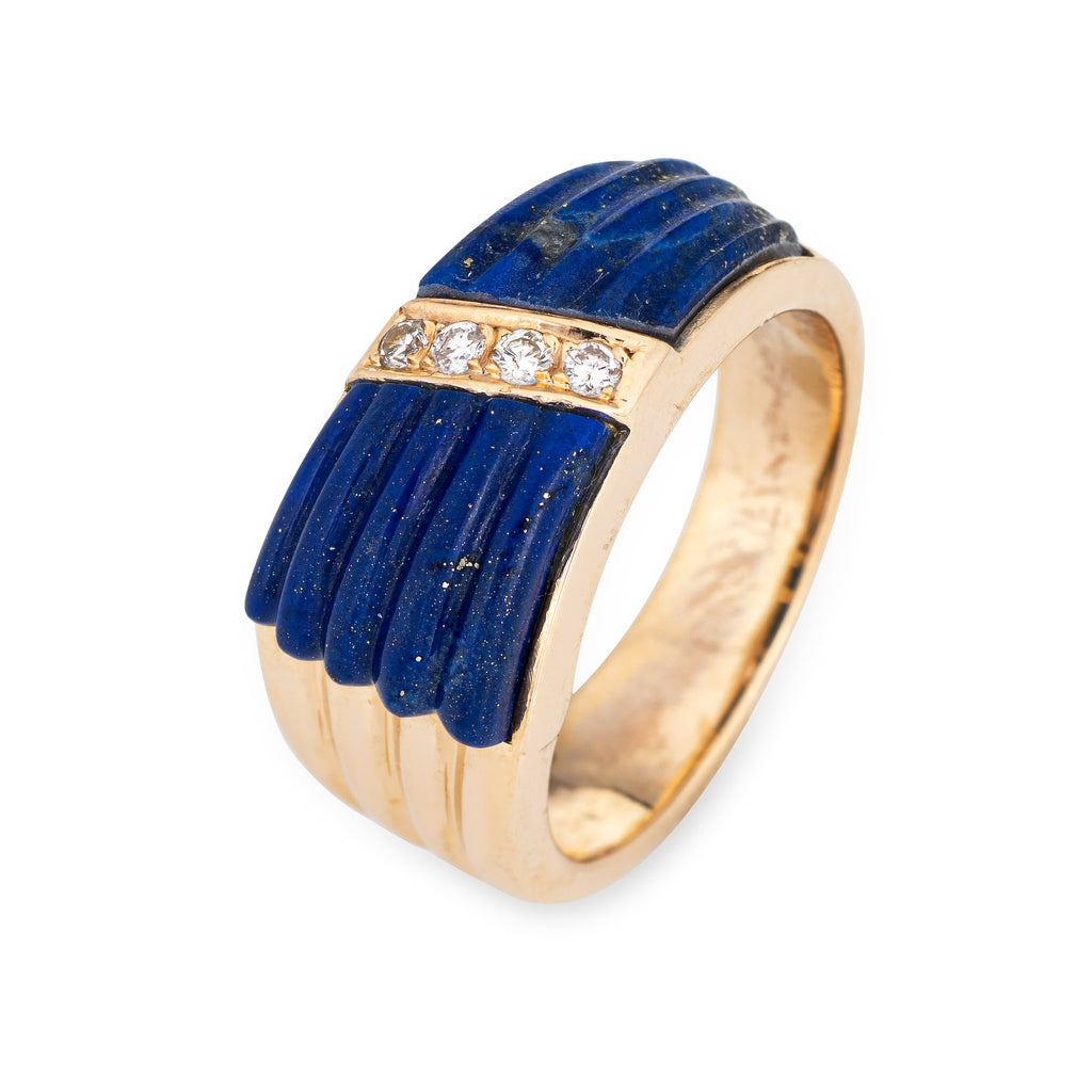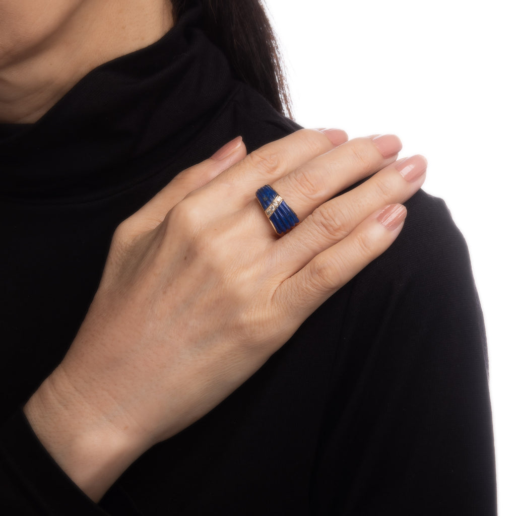 The fluted lapis lazuli graduates from 5mm to 9mm, set with a strand of diamonds to the center. The ring is great worn alone or stacked with your fine jewelry from any era. The low rise ring (5.5mm - 0.21 inches) sits comfortably on the finger.