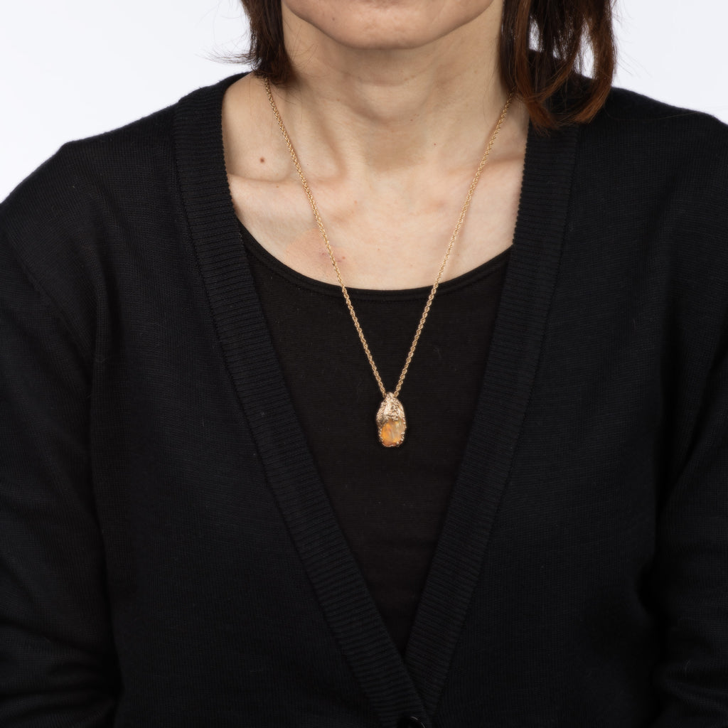The rope link necklace measures 19.5 inches in length and sits nicely below the nape of the neck. The freeform opal blends into the organic botanical motif mount with the opal lighting up in natural sunlight with a strong matrix of colors. The necklace is great worn alone or layered with your other fine necklaces from any era.