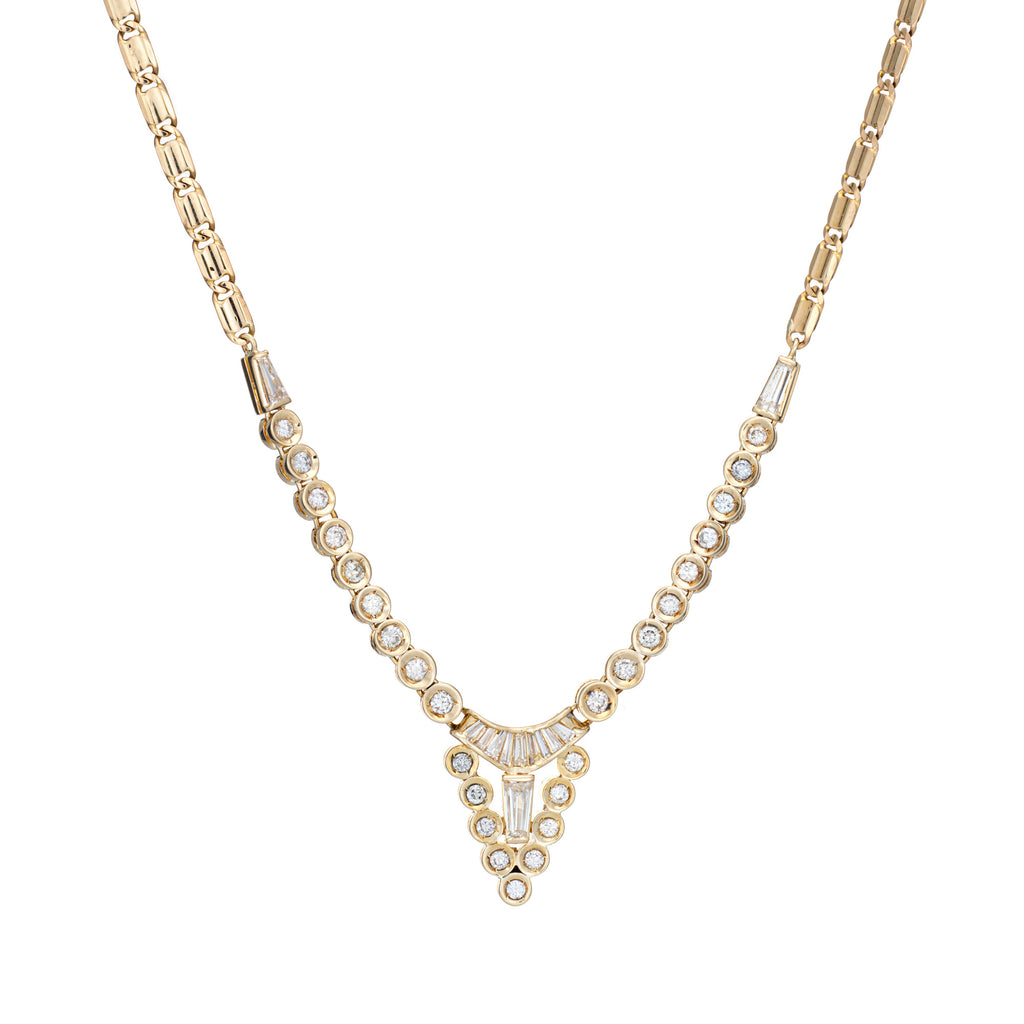 Shimmering mixed cut diamonds are bezel set into the elegant mount. The 16-inch choker length necklace sits nicely at the nape of the neck. Great worn during the day and it can easily transition to a glam evening look.