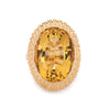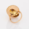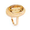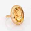The golden hued citrine, estimated at 9 carats, is securely set into a textured oval mount. The medium rise mount, designed with an open backing, is designed to show off the beauty of the gemstone. The cocktail ring makes a great statement on the hand. The ring rises 9mm from the finger (0.35 inches).