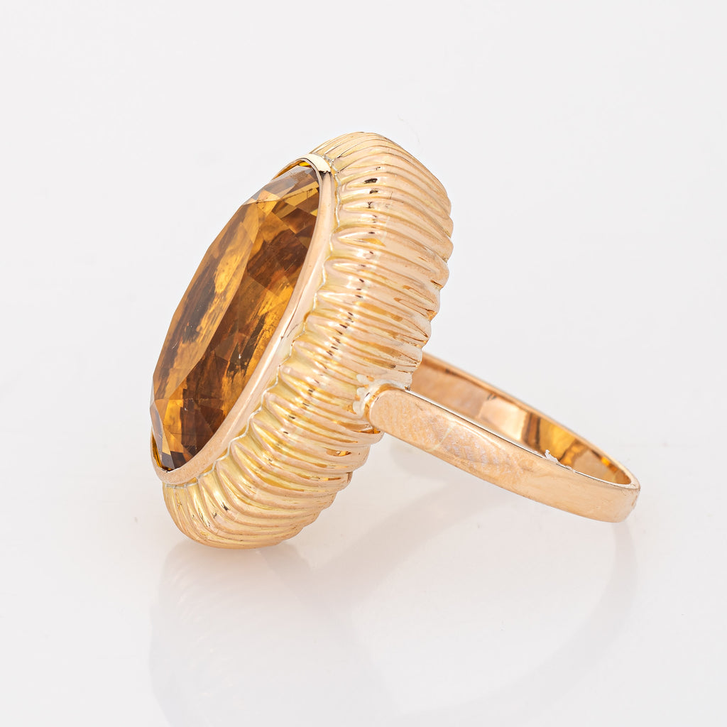 Stylish estimated 9 carat citrine cocktail ring (circa 1950s to 1960s) crafted in 14 karat yellow gold.