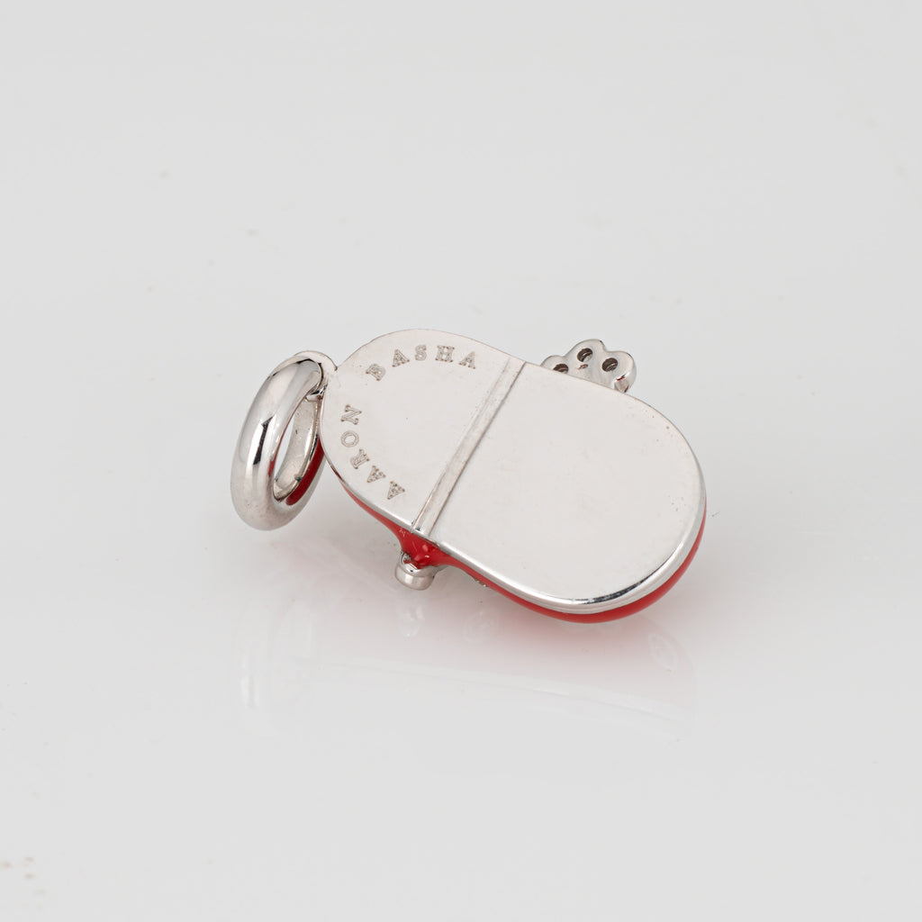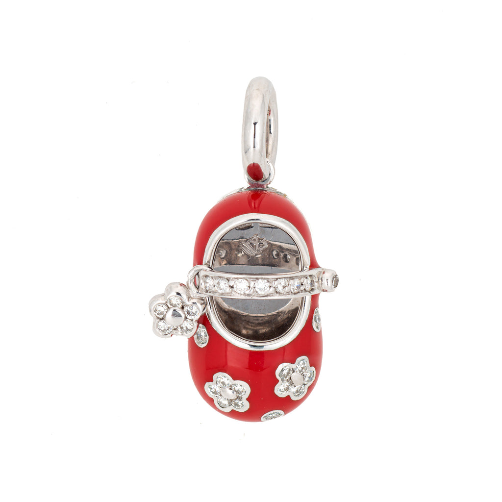 Finely detailed pre-owned Aaron Basha red enamel diamond flower shoe charm crafted in 18k white gold.