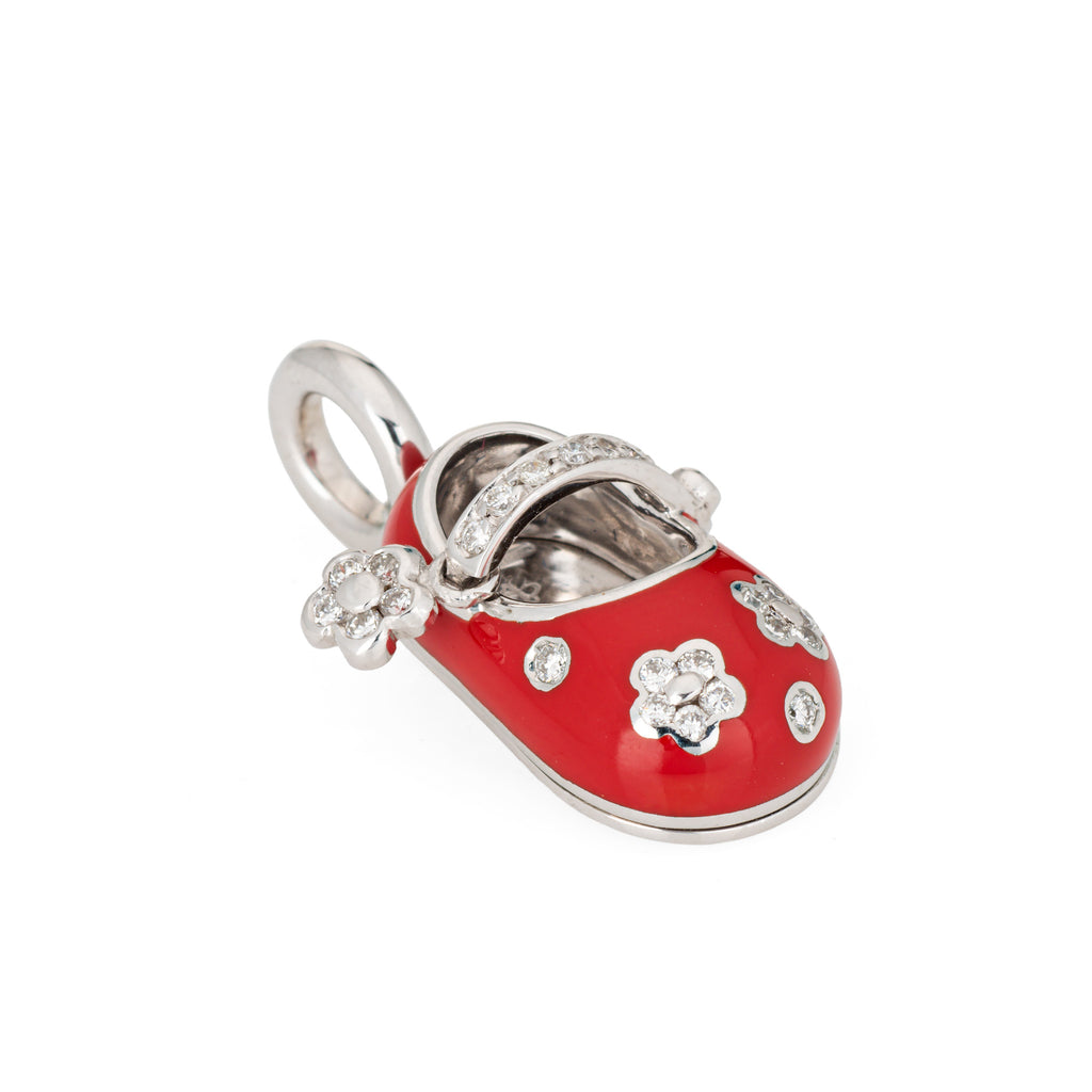 Decorated with diamond set floral accents, the charming shoe is a wonderful way to celebrate a special child in your life. The charm can be worn on a bracelet or as a pendant on a necklace.