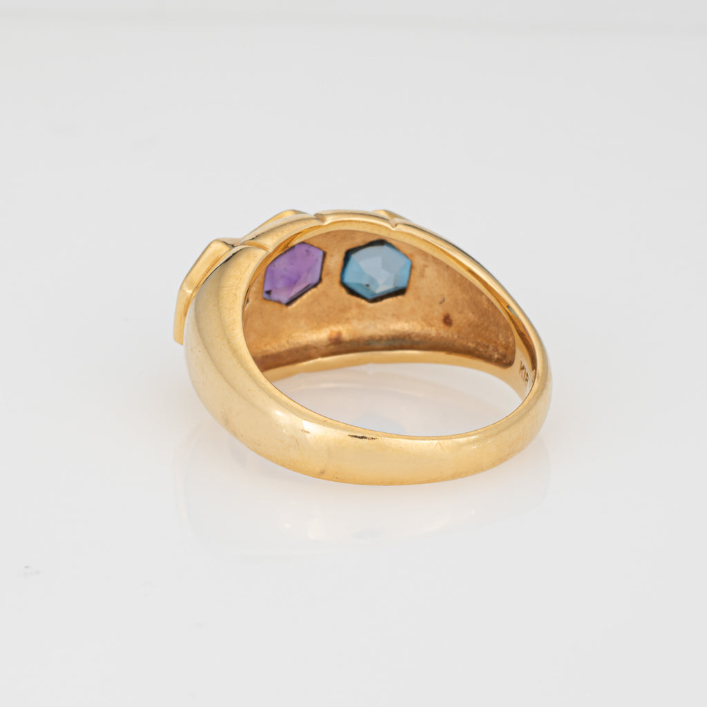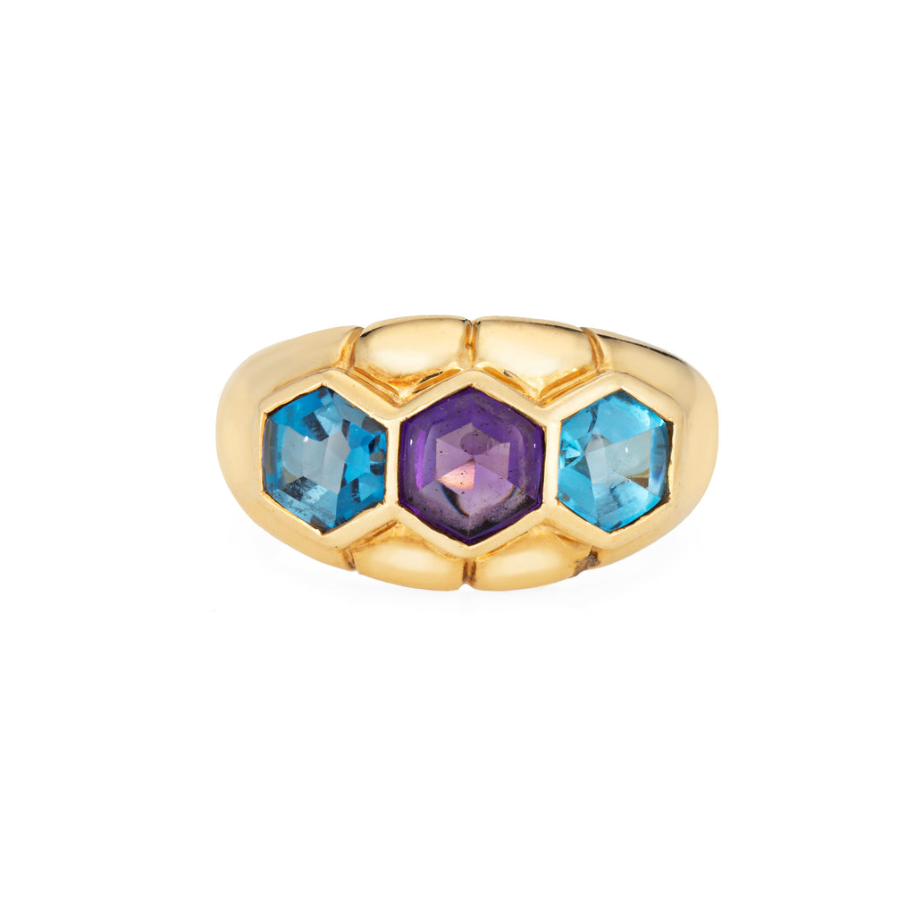 Finely detailed amethyst & blue topaz ring crafted in 18 karat yellow gold (circa 1990s).