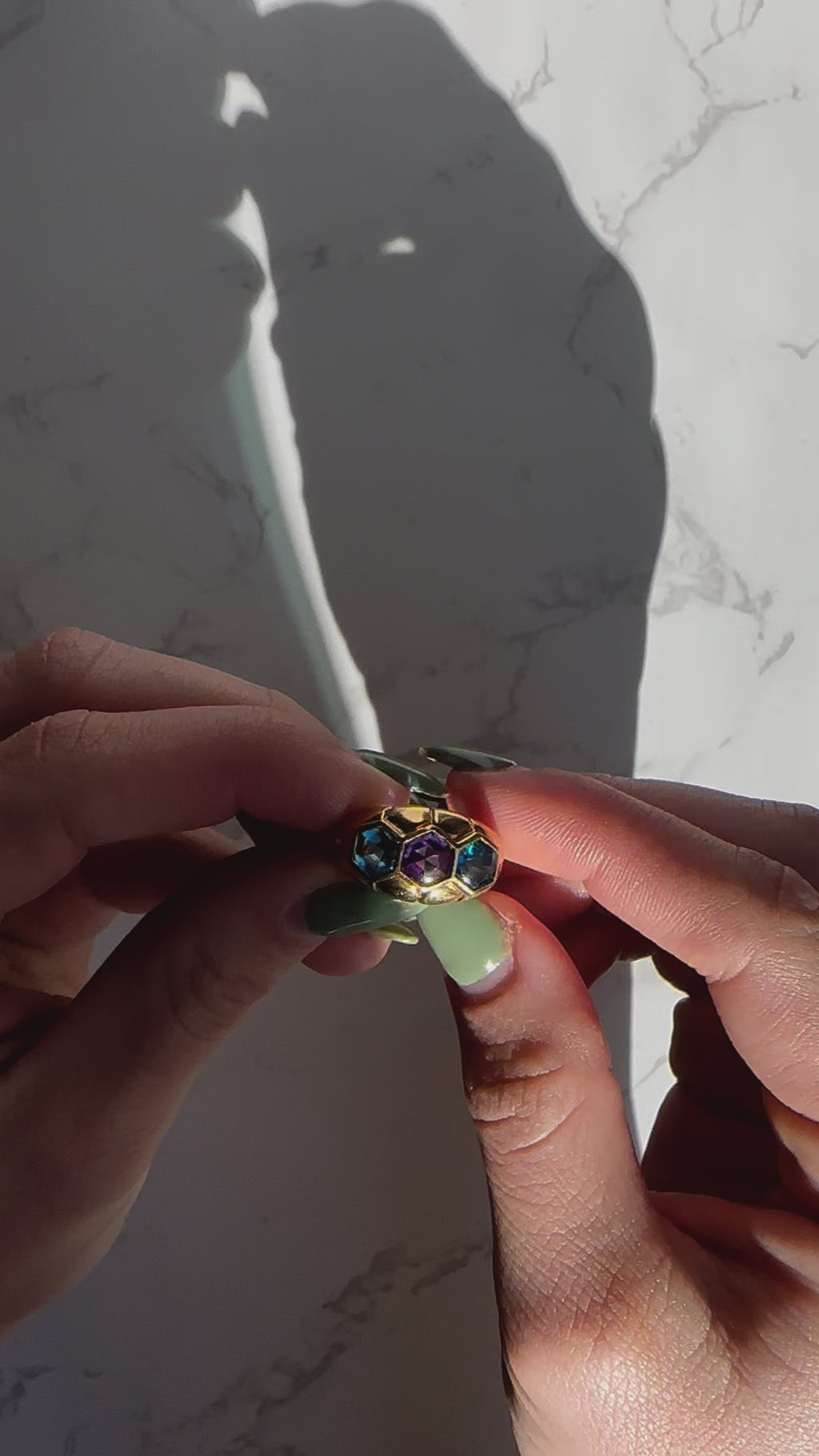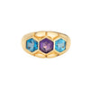 Cabochon cut amethyst and blue topaz, set into hexagonal bezel mounts, highlight a trilogy design that represents the past, present and future. The ring is great worn alone or stacked. The low rise ring (5mm - 0.19 inches) sits comfortably on the finger.