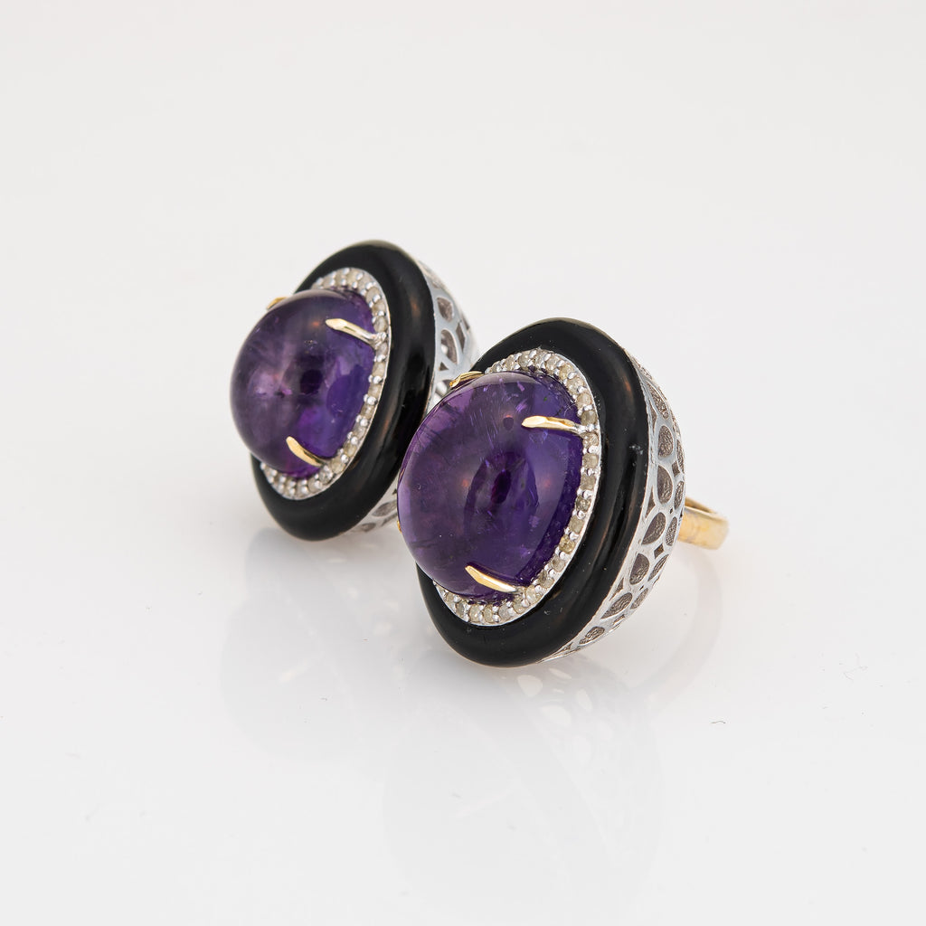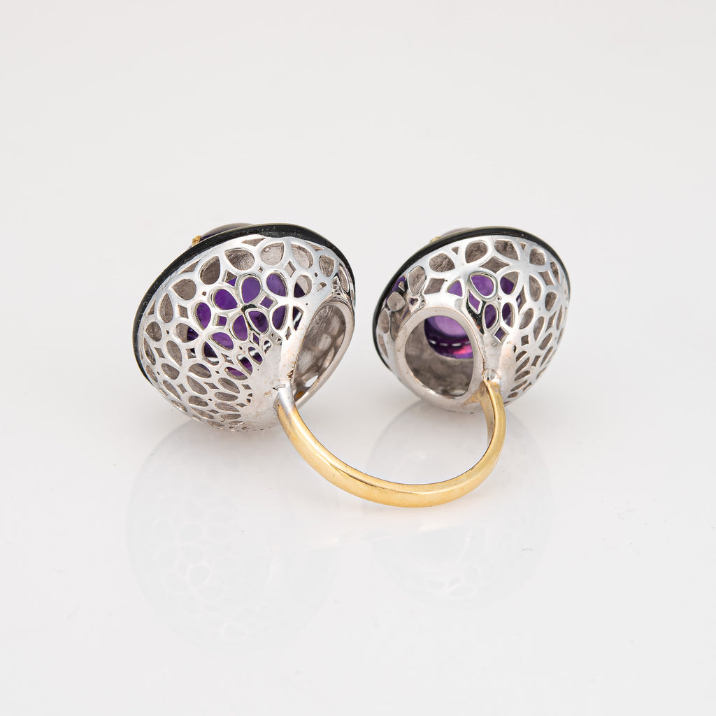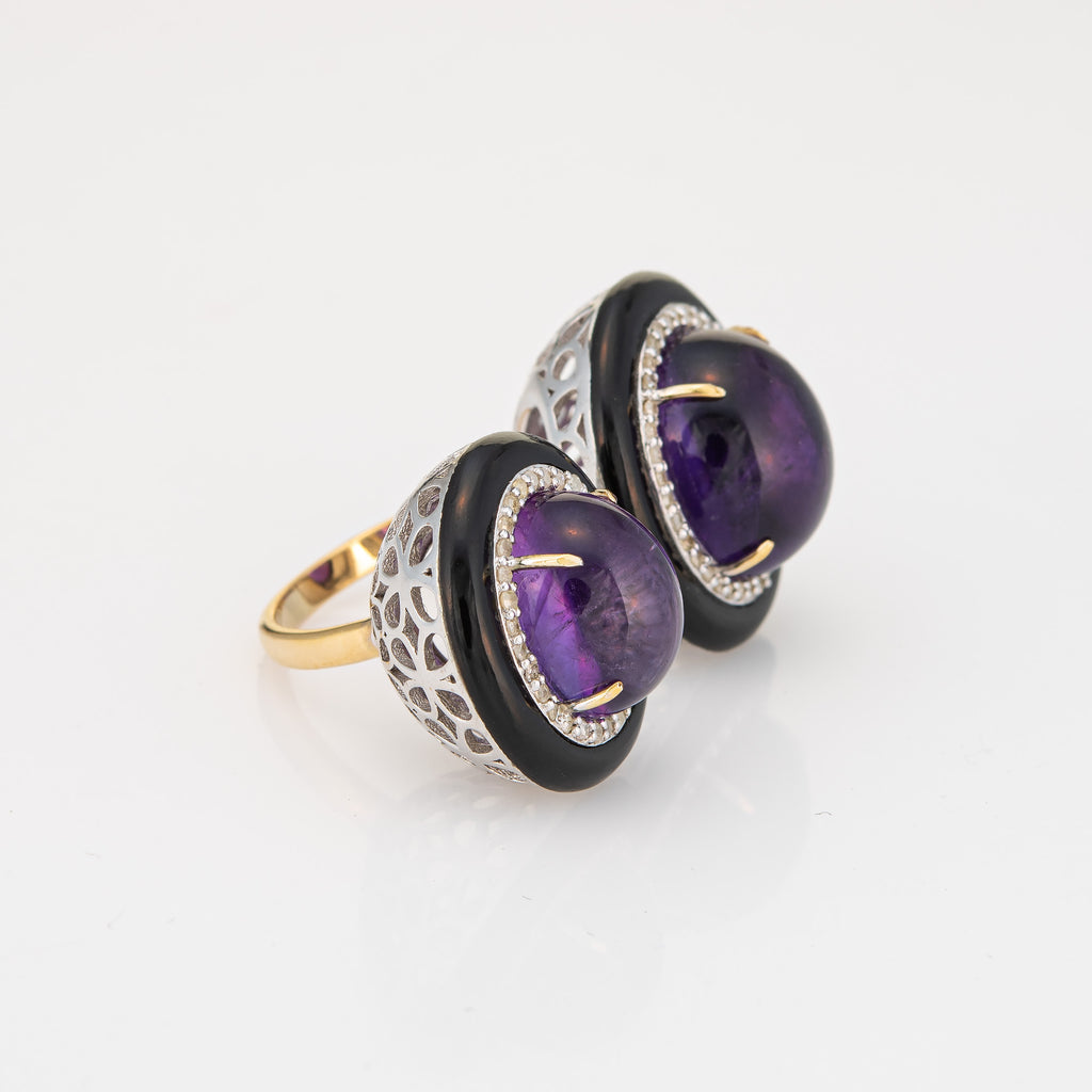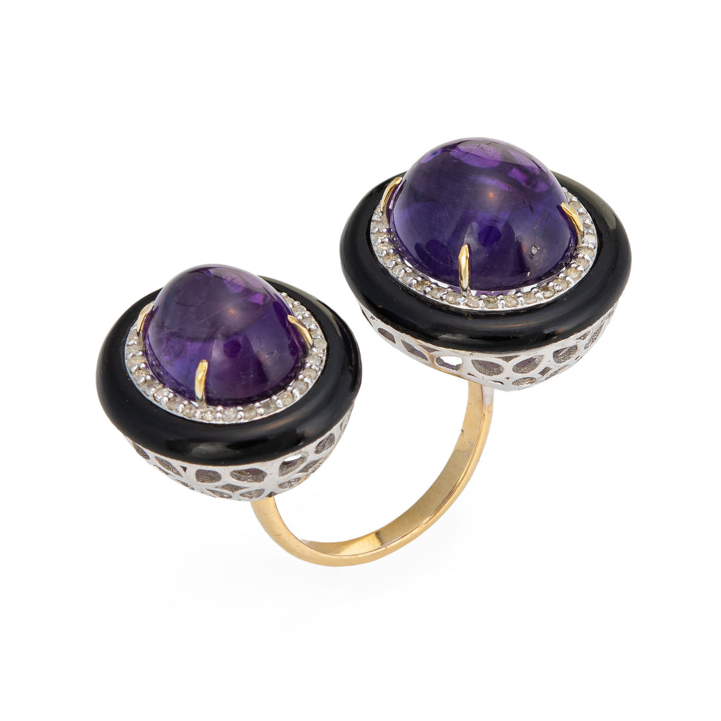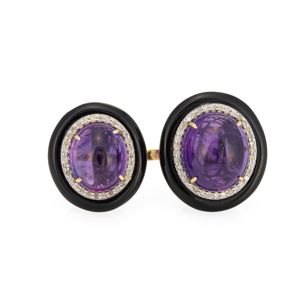 Double the look and double the impact, the amethyst & diamond cocktail ring makes a great statement on the hand! Framed with black enamel the high dome cabochon cut amethysts are a rich royal purple hue. The medium rise ring (15mm - 0.59 inches) sits comfortably on the finger.