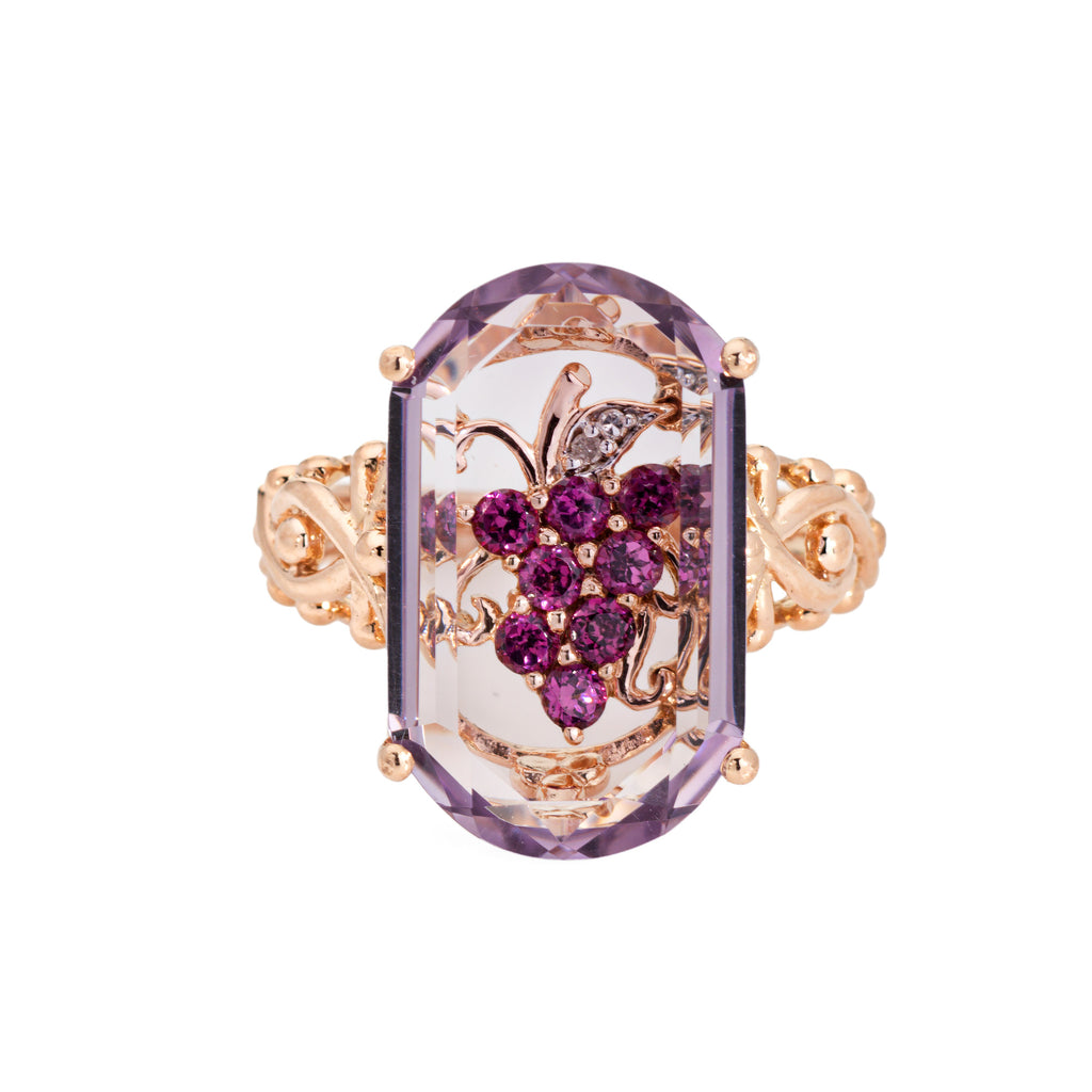 The unique ring features a grape design set to the base of the mount, with a larger amethyst prong set above it. The amethyst is free of inclusions with the grape design clearly visible to the naked eye. The cocktail ring makes a nice statement on the hand. The medium rise ring (8.5mm - 0.33 inches) sits comfortably on the finger.