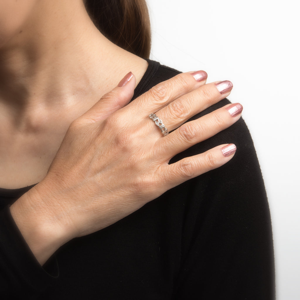 The ring epitomizes vintage charm and would make a lovely alternative wedding band. The alternating pattern of diamond and square shapes adds visual interest to the ring. Great worn alone or stacked with your jewelry from any era.