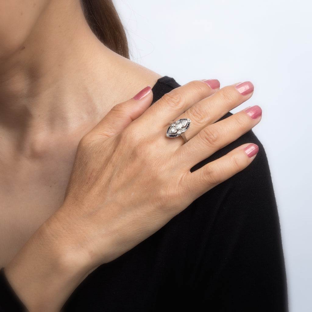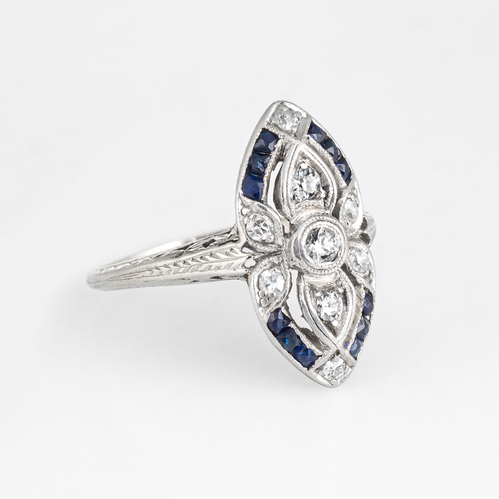 Antique Deco Diamond Sapphire Ring 18k Gold Platinum Shield Cocktail Ring 7.75