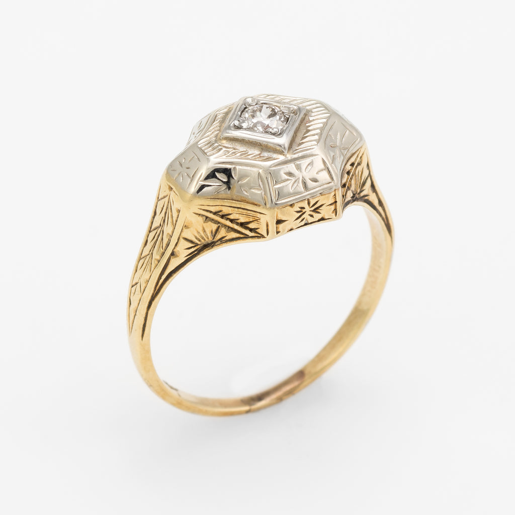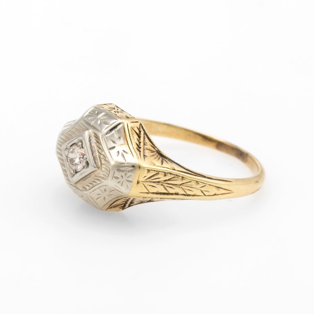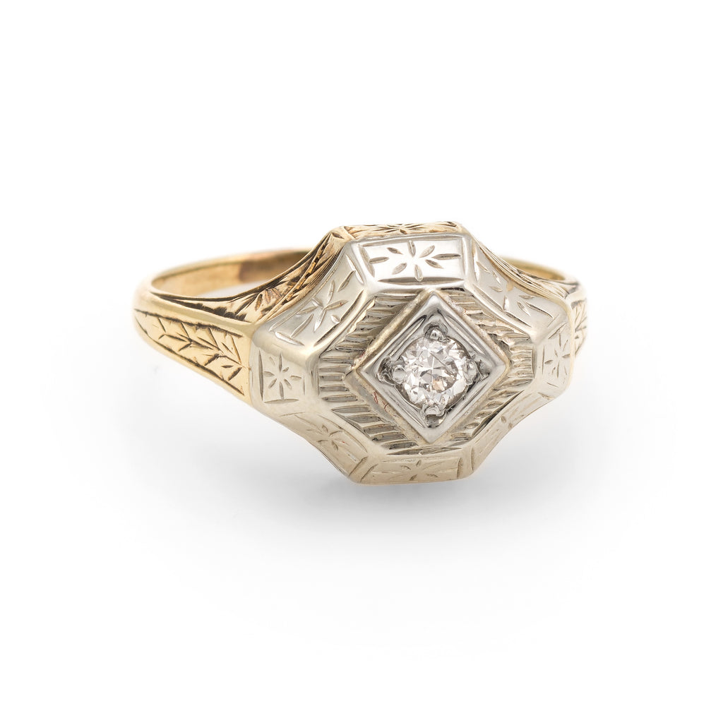 Antique Deco Two Tone Diamond Ring Vintage 14k Gold Estate Fine Jewelry Etched